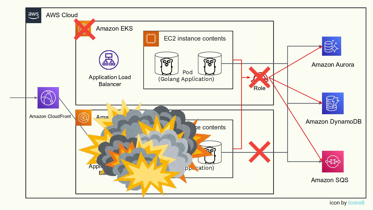 instance contents Application Load Balancer Pod (Golang Application) Amazon EKS EC2 instance contents Application Load Balancer Pod (Golang Application) Amazon SQS Amazon DynamoDB Amazon Aurora Role