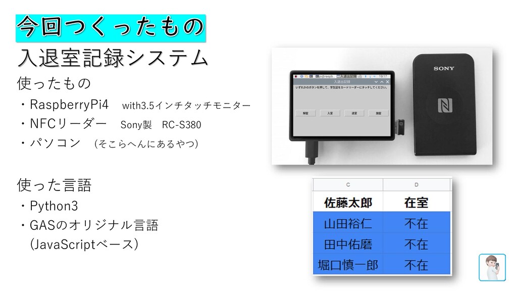 入退室記録システム 使ったもの ・RaspberryPi4 with3.5インチタッチモニター ・NFCリーダー Sony製 RC-S380 ・パソコン (そこらへんにあるやつ) 使った言語