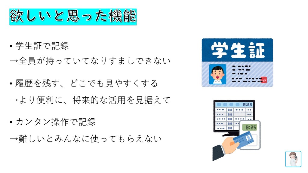 • 学生証で記録 →全員が持っていてなりすましできない • 履歴を残す、どこでも見やすくする →より便利に、将来的な活用を見据えて • カンタン操作で記録 →難しいとみんなに使ってもらえない