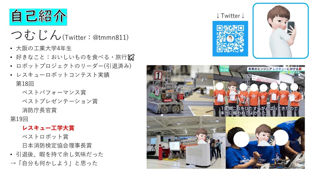 つむじん(Twitter:@tmmn811) • 大阪の工業大学4年生 • 好きなこと:おいしいものを食べる・旅行✈ • ロボットプロジェクトのリーダー(引退済み) • レスキューロボットコンテスト実績 第18回