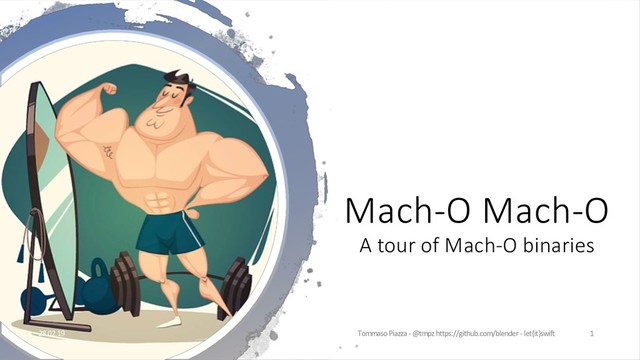 of bytes on disk • Used by Mach Kernels • macOS, iOS, tvOS, watchOS, GNU Hurd Tom m aso Piazza - @ tm pz https://github.com /blender - let{it}swift 28.02.19 3