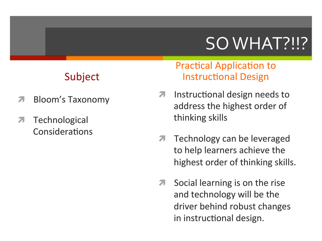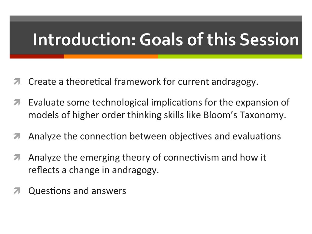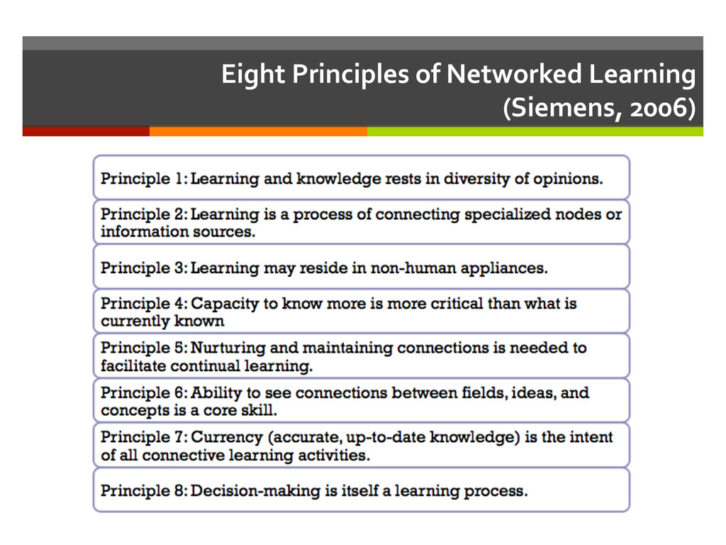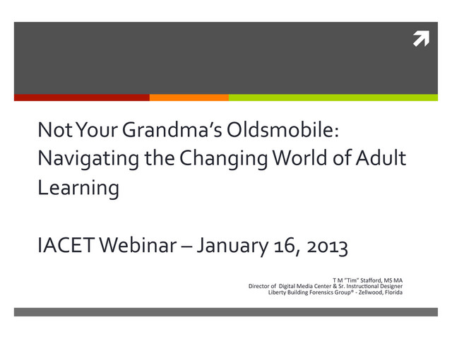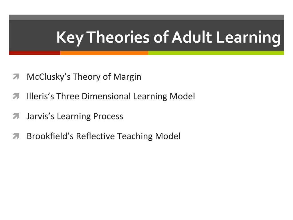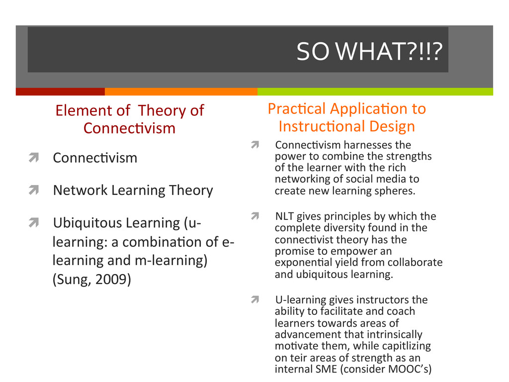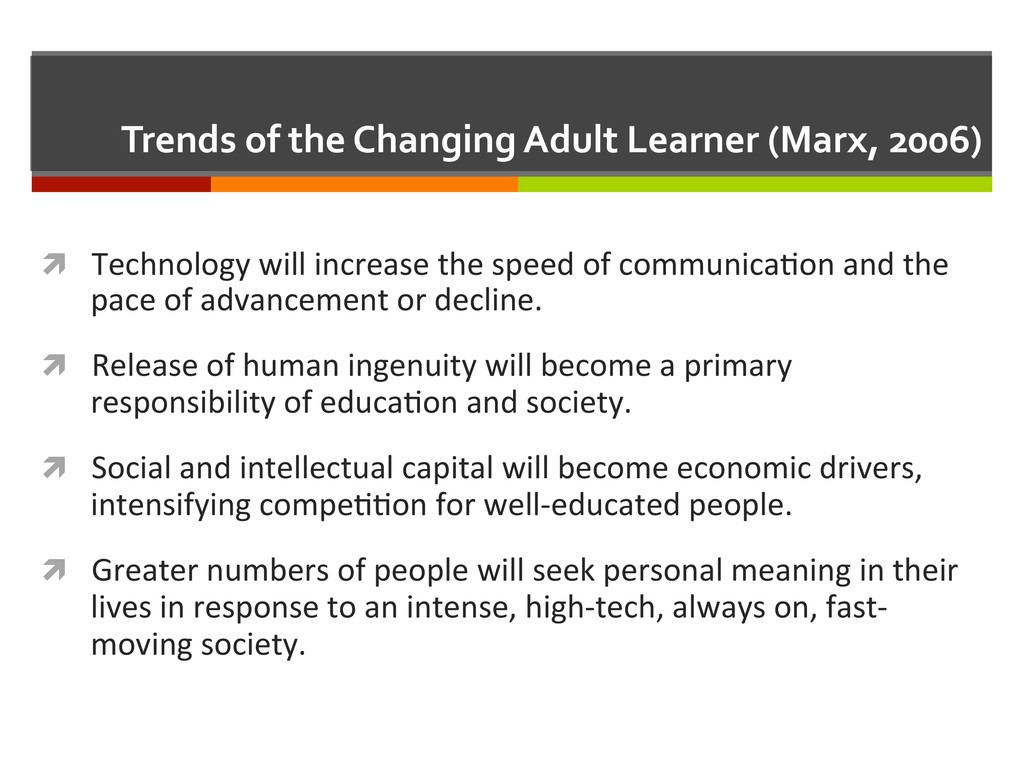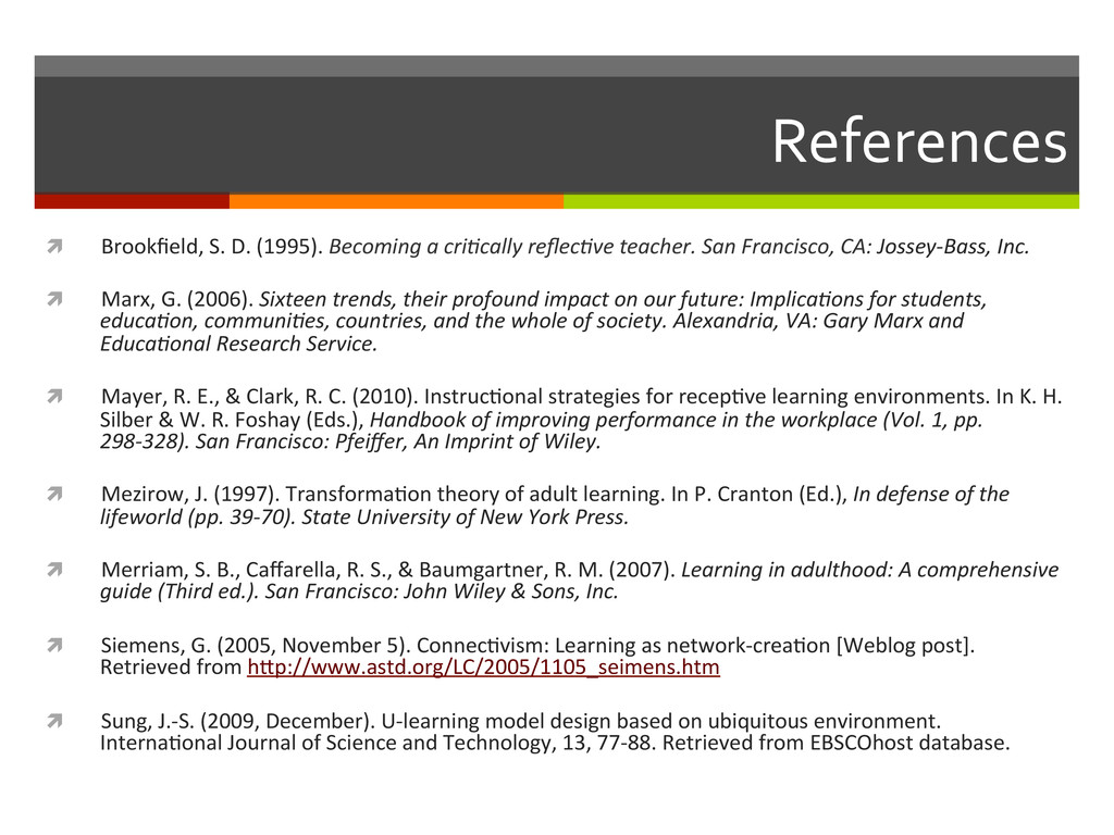 reflec,ve teacher. San Francisco, CA: Jossey-‐Bass, Inc. ì Marx, G. (2006). Sixteen trends, their profound impact on our future: Implica,ons for students, educa,on, communi,es, countries, and the whole of society. Alexandria, VA: Gary Marx and Educa,onal Research Service. ì Mayer, R. E., & Clark, R. C. (2010). Instruc=onal strategies for recep=ve learning environments. In K. H. Silber & W. R. Foshay (Eds.), Handbook of improving performance in the workplace (Vol. 1, pp. 298-‐328). San Francisco: Pfeiffer, An Imprint of Wiley. ì Mezirow, J. (1997). Transforma=on theory of adult learning. In P. Cranton (Ed.), In defense of the lifeworld (pp. 39-‐70). State University of New York Press. ì Merriam, S. B., Caffarella, R. S., & Baumgartner, R. M. (2007). Learning in adulthood: A comprehensive guide (Third ed.). San Francisco: John Wiley & Sons, Inc. ì Siemens, G. (2005, November 5). Connec=vism: Learning as network-‐crea=on [Weblog post]. Retrieved from hop://www.astd.org/LC/2005/1105_seimens.htm ì Sung, J.-‐S. (2009, December). U-‐learning model design based on ubiquitous environment. Interna=onal Journal of Science and Technology, 13, 77-‐88. Retrieved from EBSCOhost database.