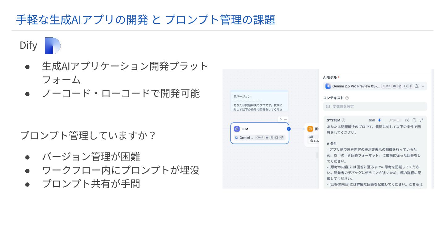 Dify • ⽣成AIアプリケーション開発プラット フォーム • ノーコード‧ローコードで開発可能 プロンプト管理していますか? • バージョン管理が困難 •