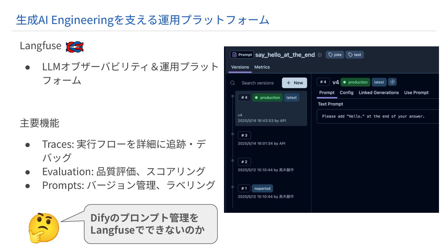 Evaluation: 品質評価、スコアリング • Prompts: バージョン管理、ラベリング ⽣成AI Engineeringを⽀える運⽤プラットフォーム 🤔 Difyのプロンプト管理を Langfuseでできないのか