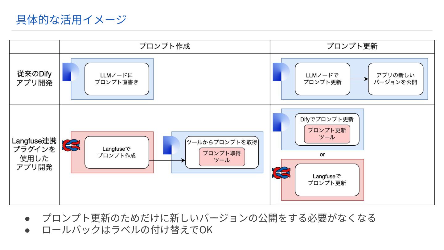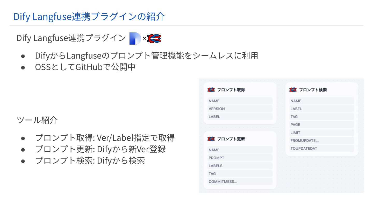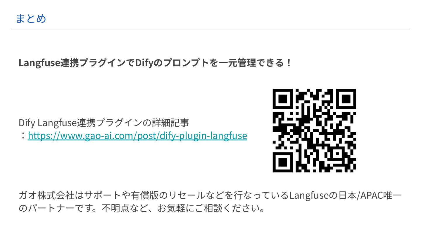 Langfuse連携プラグインでDifyのプロンプトを⼀元管理できる! Dify Langfuse連携プラグインの詳細記事 :https://www.gao-ai.com/post/dify-plugin-langfuse ガオ株式会社はサポートや有償版のリセールなどを⾏なっているLangfuseの⽇本/APAC唯⼀ のパートナーです。不明点など、お気軽にご相談ください。 まとめ