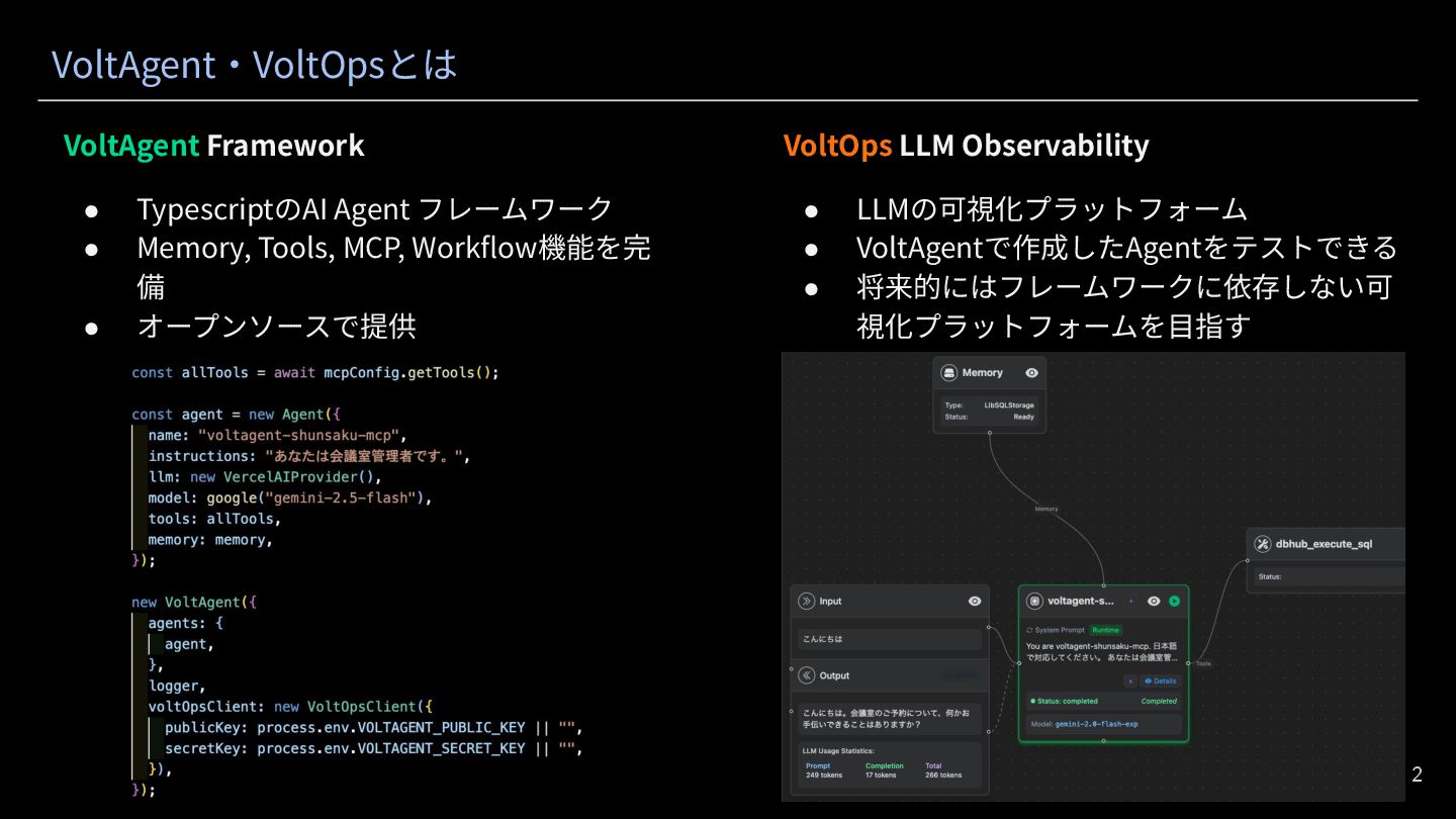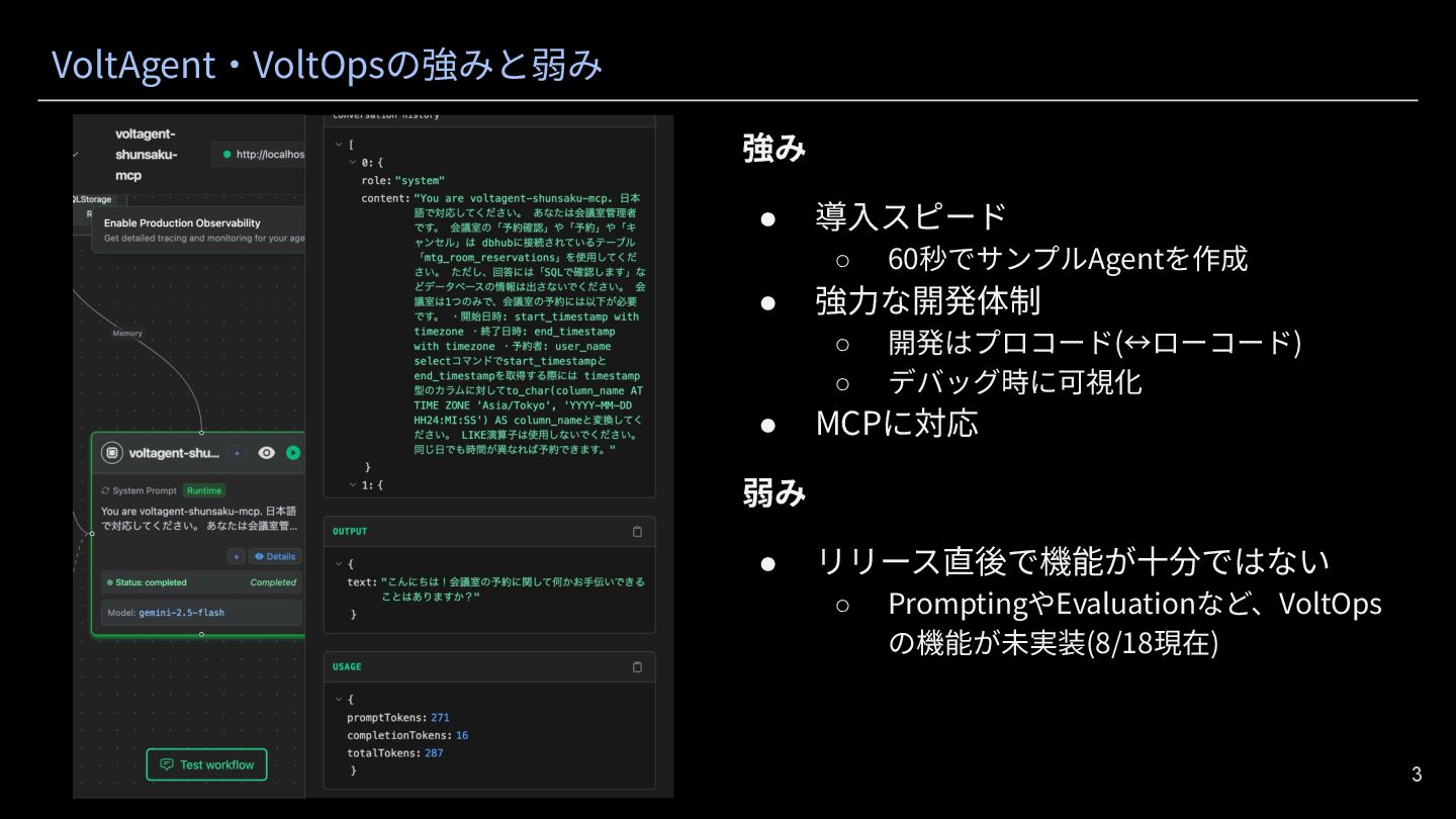 MCP, Workflow機能を完 備 • オープンソースで提供 VoltOps LLM Observability • LLMの可視化プラットフォーム • VoltAgentで作成したAgentをテストできる • 将来的にはフレームワークに依存しない可 視化プラットフォームを⽬指す 2