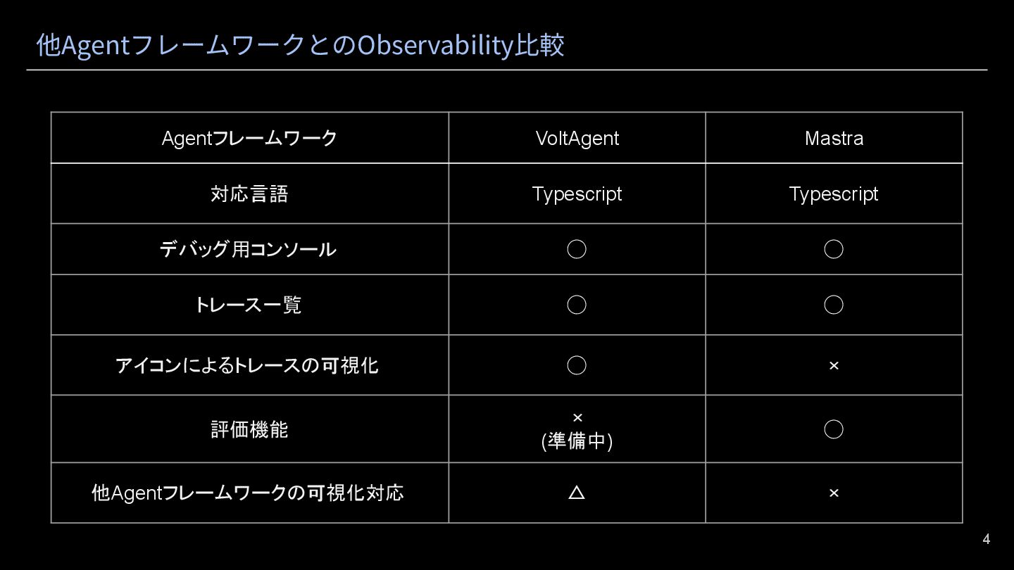 4 他AgentフレームワークとのObservability⽐較 Agentフレームワーク VoltAgent Mastra 対応言語 Typescript Typescript デバッグ用コンソール ◯