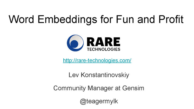 1. Word Embeddings for Fun and Profit Lev Konstantinovskiy Community Manager