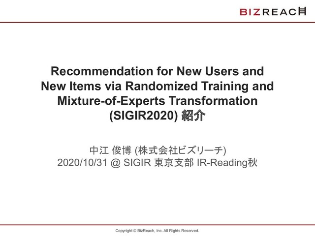 • Ziwei Zhu, Shahin Sefati, James Caverlee • Recommendation for New Users and New Items via Randomized Training and Mixture-of-Experts Transformation (SIGIR2020) ▪ 結論の概要 • User/Item 両方の Cold-Start の状況に対応したレコメンドの提案 • 推薦モデル Heater を提案 ▪ 3つの工夫 • 学習済みの中間 representation との誤差項を Loss に入れる • 属性モデル出力を学習済み representation とランダムに入れ替える。 • モデルを多数組み合わせて、アンサンブルをとる。 3