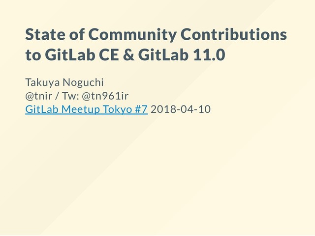 State of Community Contributions to GitLab CE & GitLab 11.0 GitLab Meetup Tokyo #7 @ Cybozu 2018-04-10 https://gitlab-jp.connpass.com/event/83738/