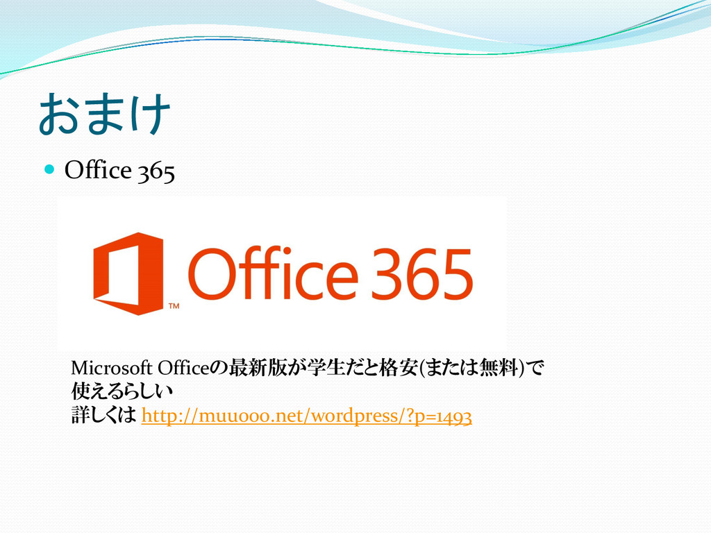 おまけ Office 365 Microsoft Officeの最新版が学生だと格安(または無料)で 使えるらしい 詳しくは http://muu000.net/wordpress/?p=1493