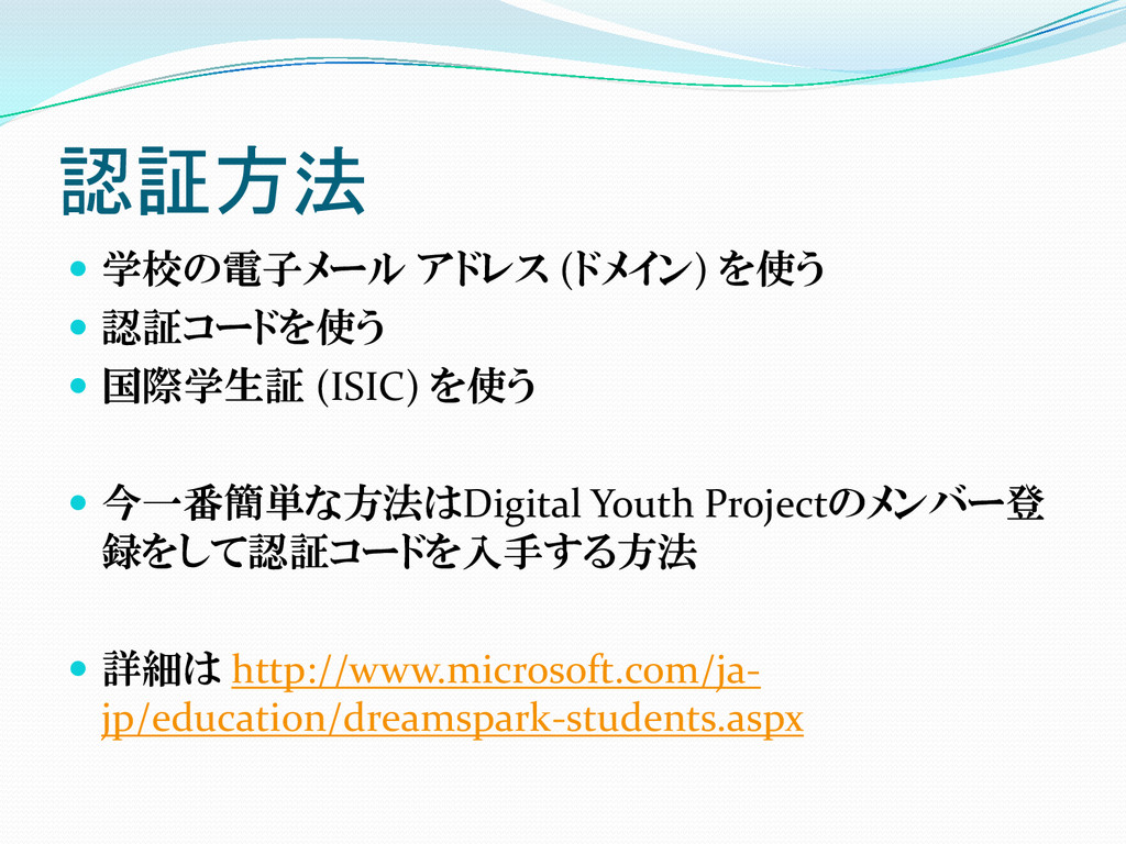 (ISIC) を使う 今一番簡単な方法はDigital Youth Projectのメンバー登 録をして認証コードを入手する方法 詳細は http://www.microsoft.com/ja- jp/education/dreamspark-students.aspx