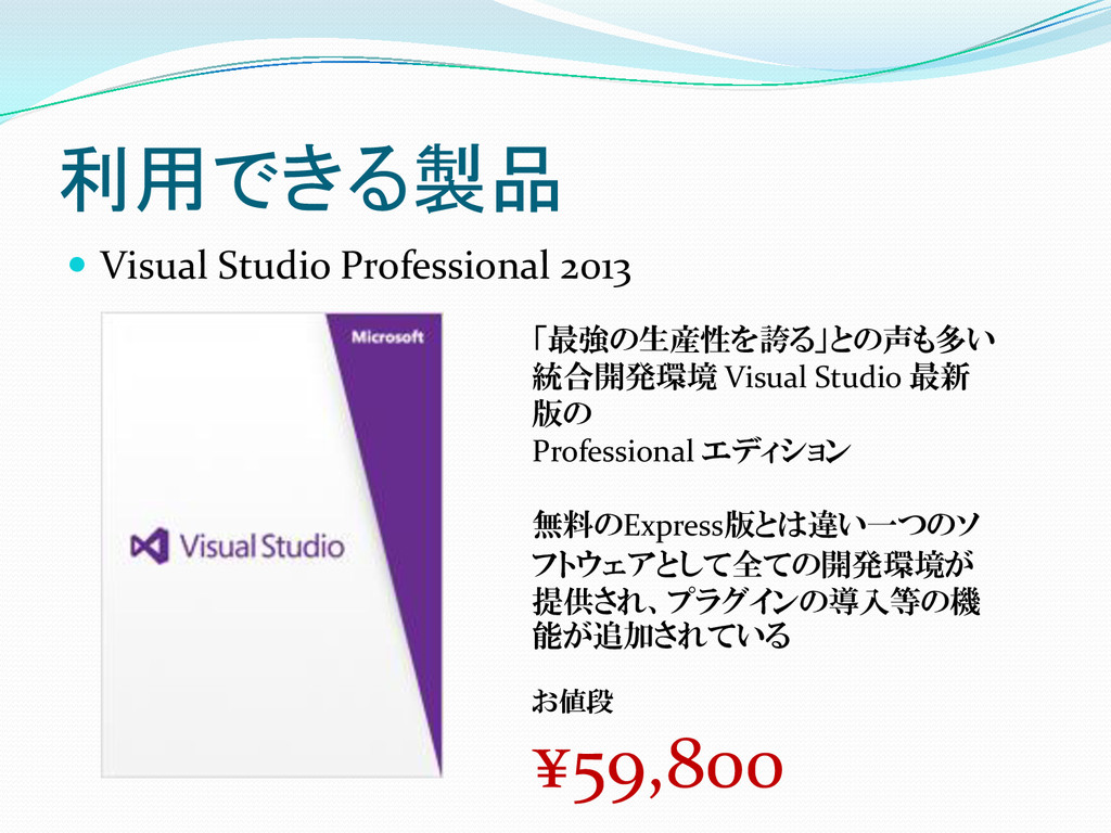 利用できる製品 Visual Studio Professional 2013 「最強の生産性を誇る」との声も多い 統合開発環境 Visual Studio