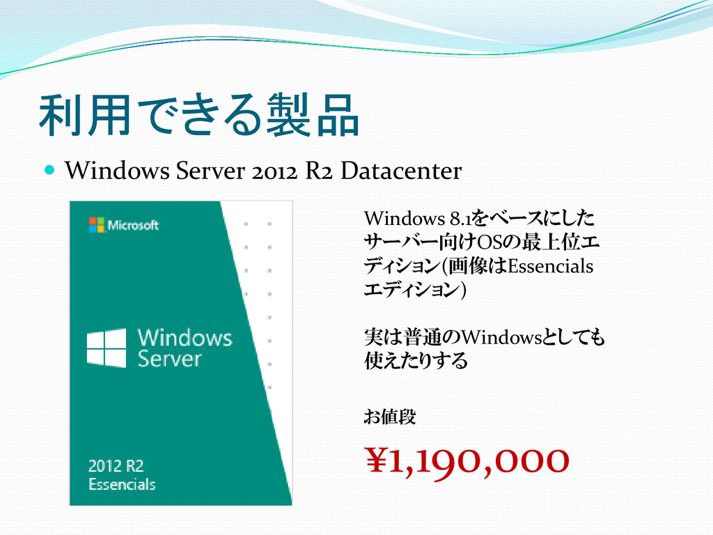 利用できる製品 Windows Server 2012 R2 Datacenter Windows 8.1をベースにした サーバー向けOSの最上位エ