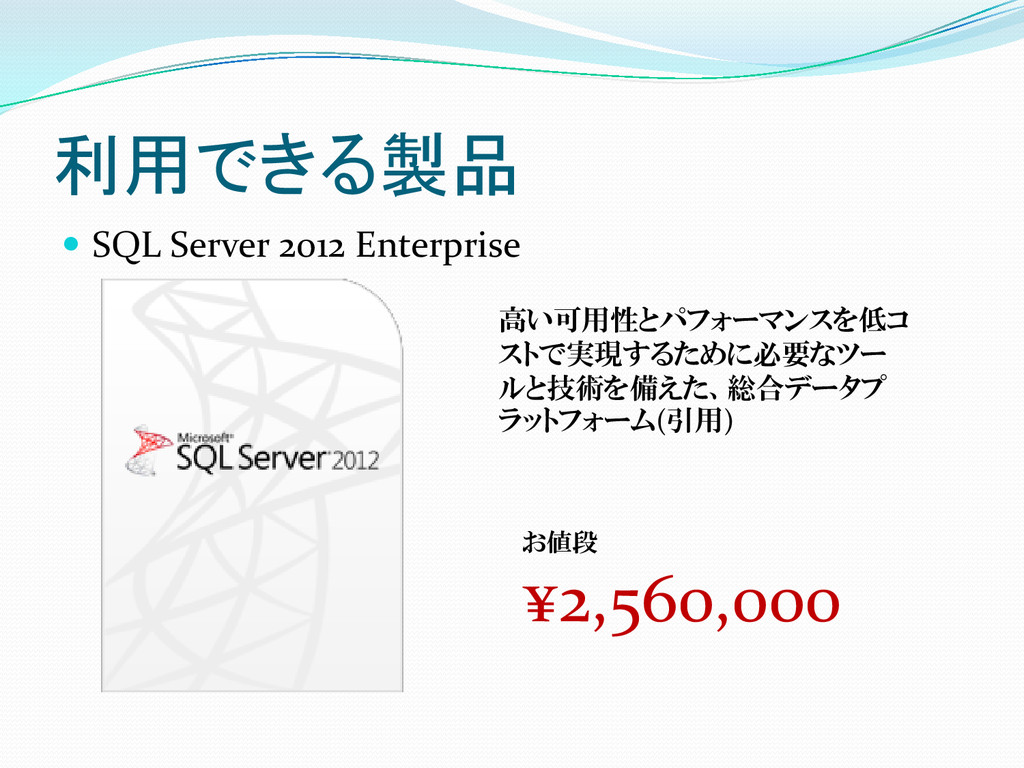 利用できる製品 SQL Server 2012 Enterprise 高い可用性とパフォーマンスを低コ ストで実現するために必要なツー ルと技術を備えた、総合データプ ラットフォーム(引用)