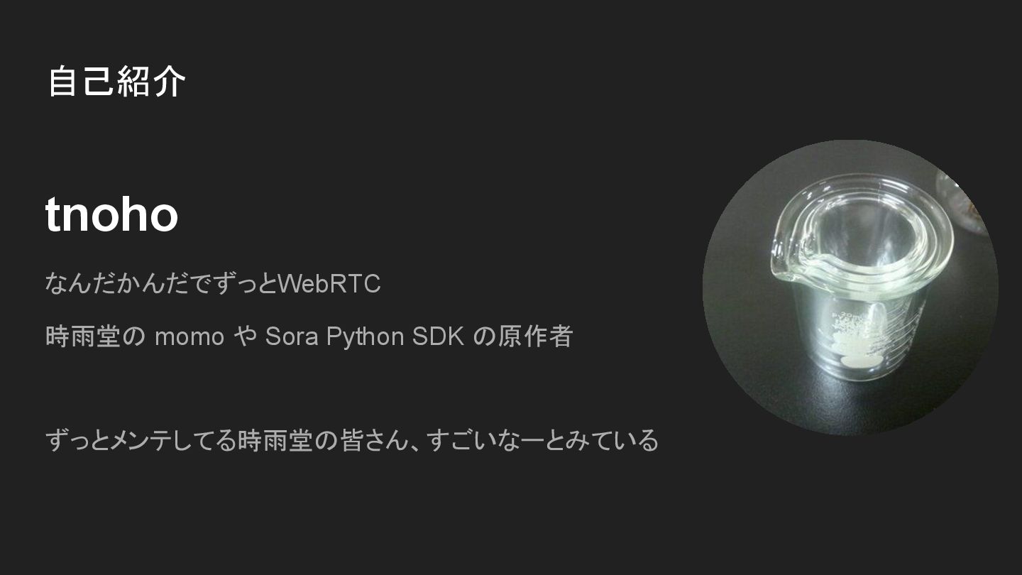 自己紹介 tnoho なんだかんだでずっとWebRTC 時雨堂の momo や Sora Python SDK の原作者