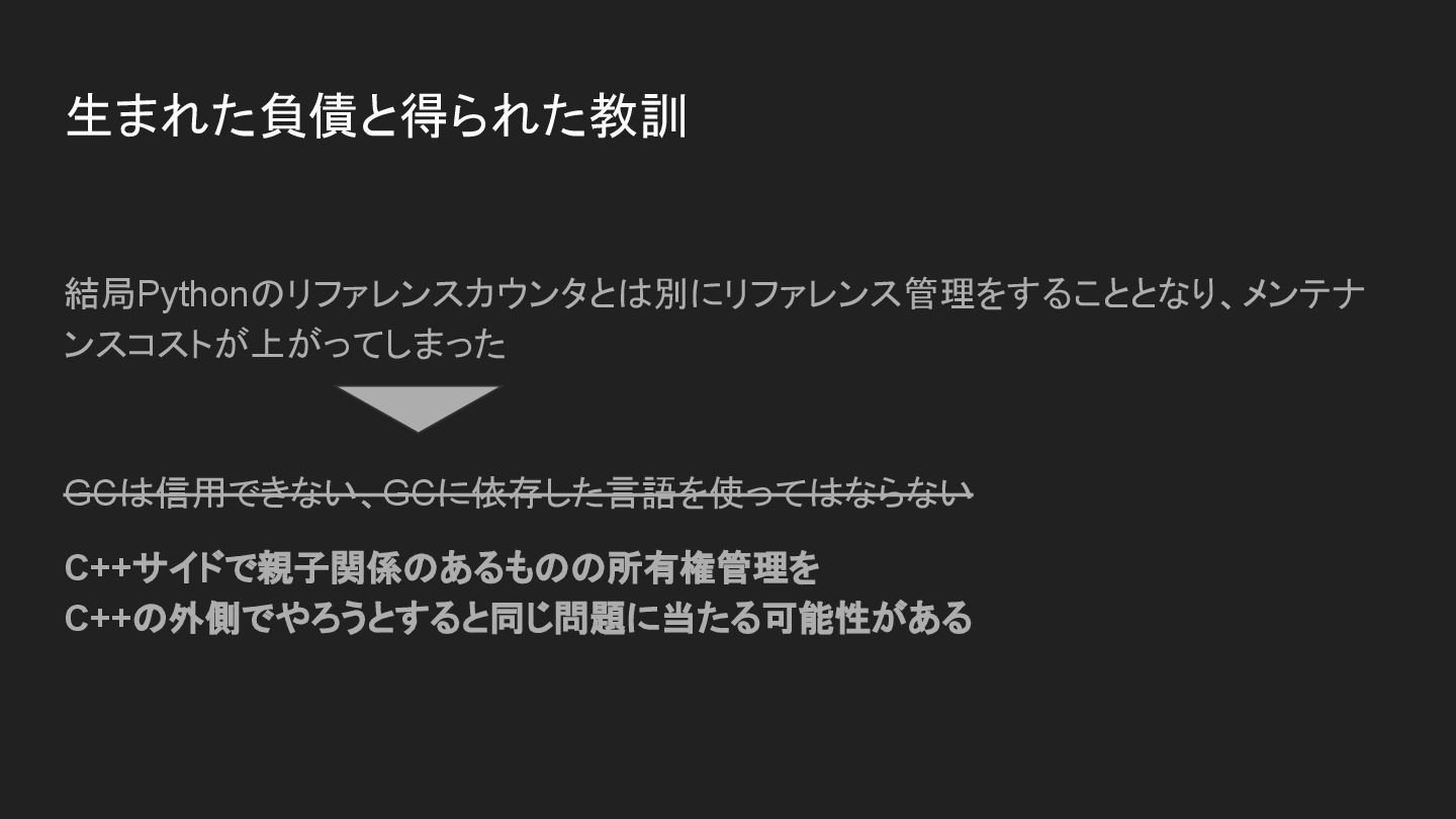 生まれた負債と得られた教訓 結局Pythonのリファレンスカウンタとは別にリファレンス管理をすることとなり、メンテナ ンスコストが上がってしまった GCは信用できない、GCに依存した言語を使ってはならない C++サイドで親子関係のあるものの所有権管理を C++の外側でやろうとすると同じ問題に当たる可能性がある