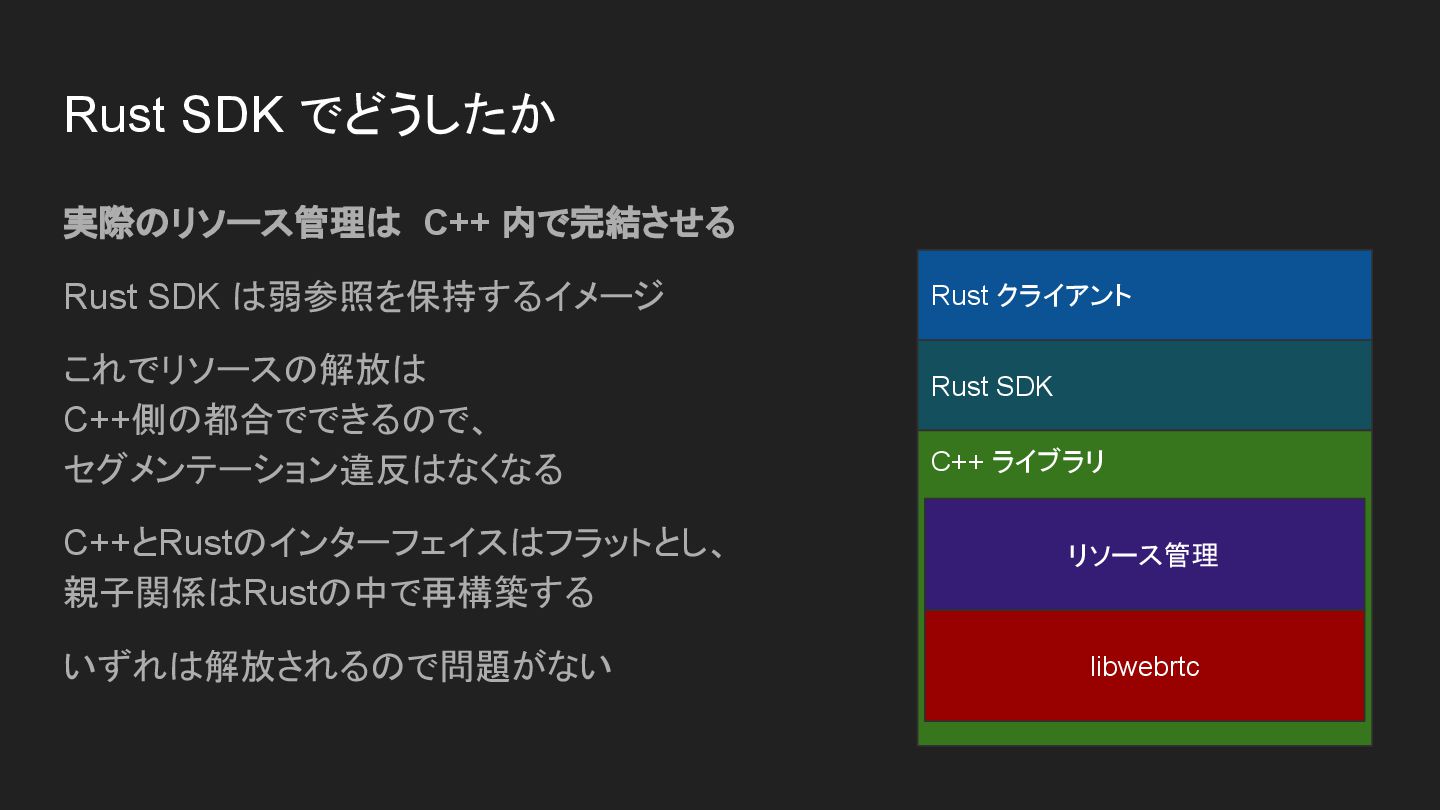 実際のリソース管理は C++ 内で完結させる Rust SDK は弱参照を保持するイメージ これでリソースの解放は C++側の都合でできるので、 セグメンテーション違反はなくなる C++とRustのインターフェイスはフラットとし、