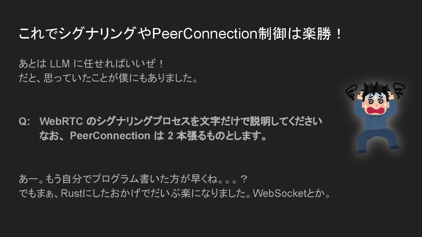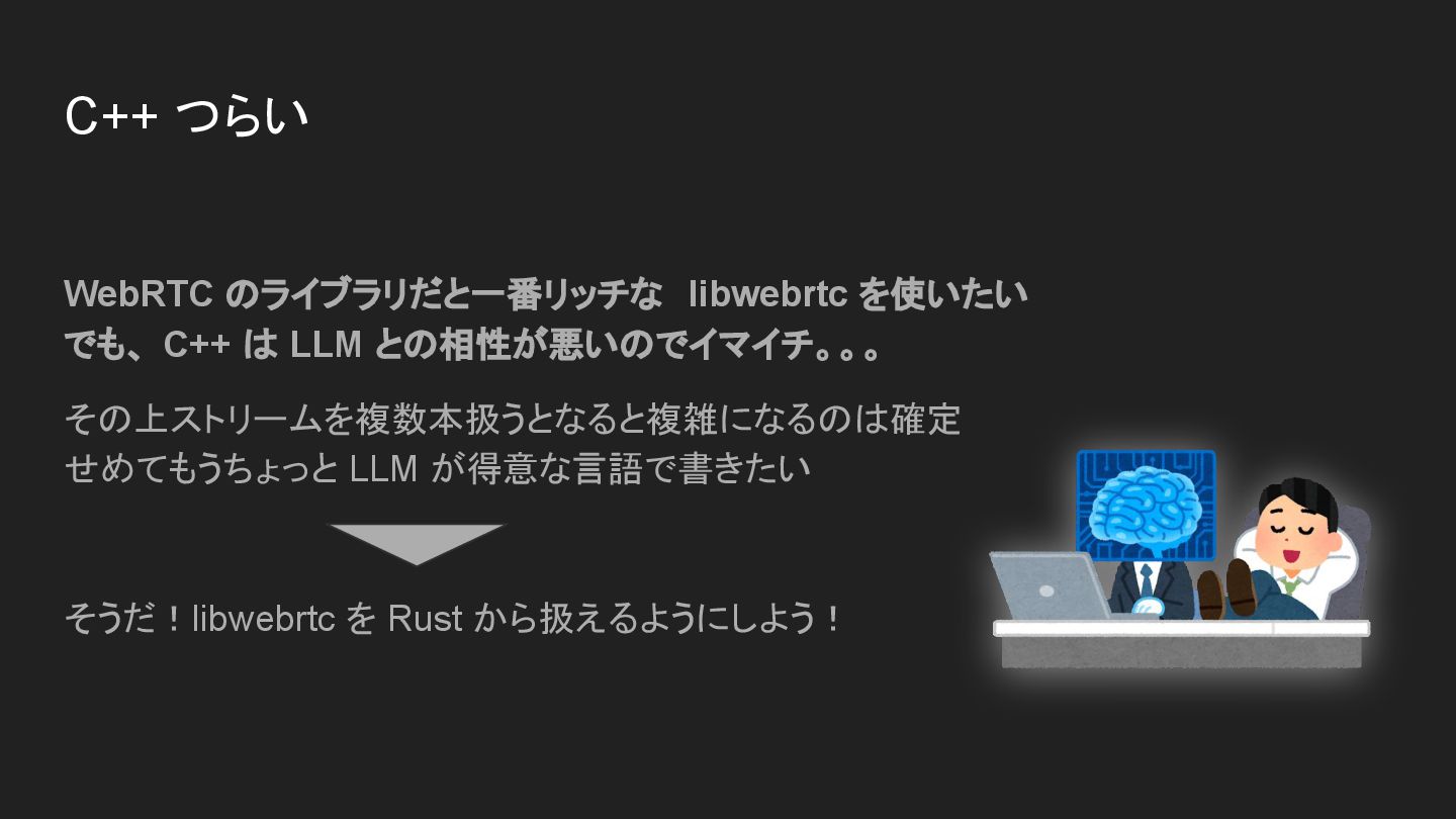 との相性が悪いのでイマイチ。。。 その上ストリームを複数本扱うとなると複雑になるのは確定 せめてもうちょっと LLM が得意な言語で書きたい そうだ!libwebrtc を Rust から扱えるようにしよう!