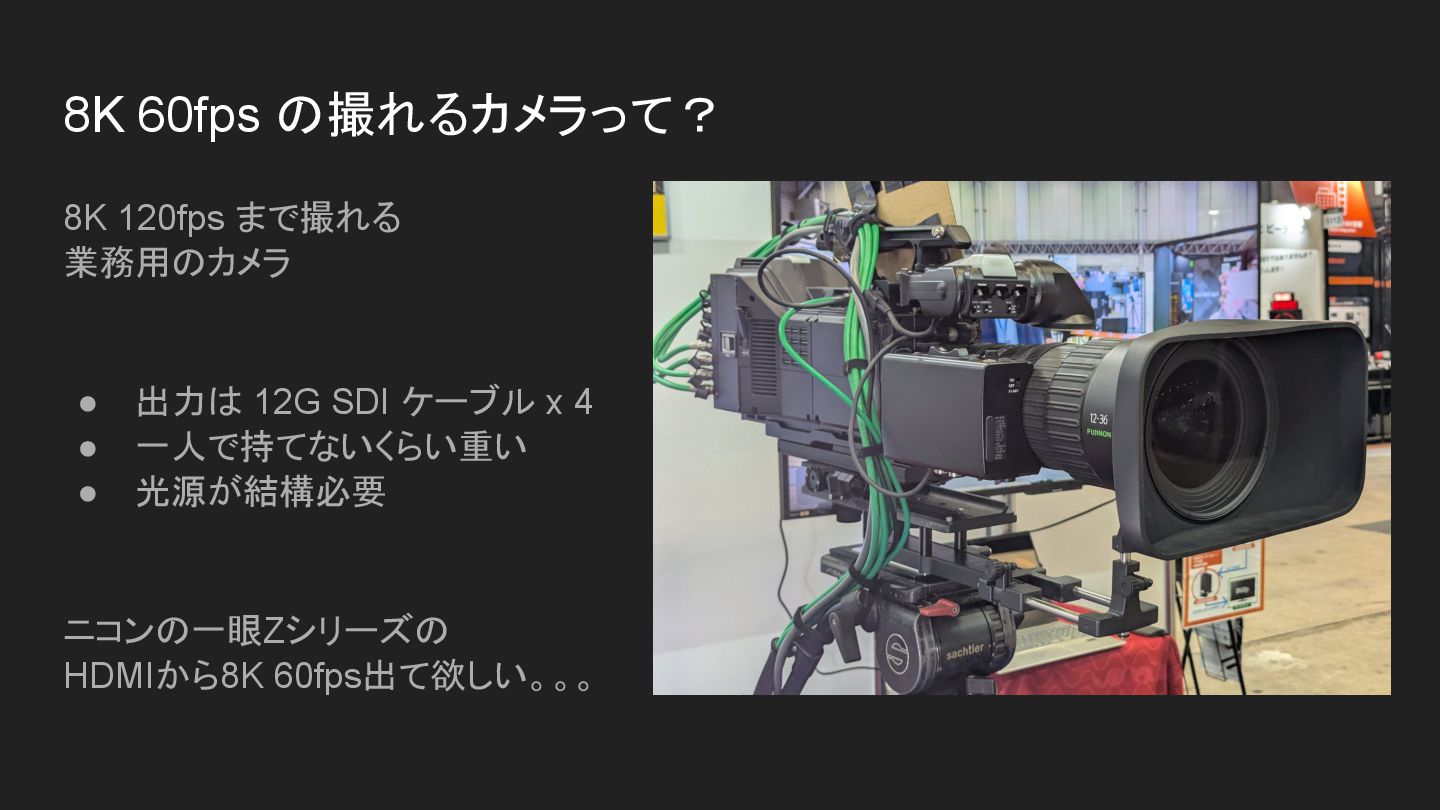 SDI ケーブル x 4 • 一人で持てないくらい重い • 光源が結構必要 ニコンの一眼Zシリーズの HDMIから8K 60fps出て欲しい。。。