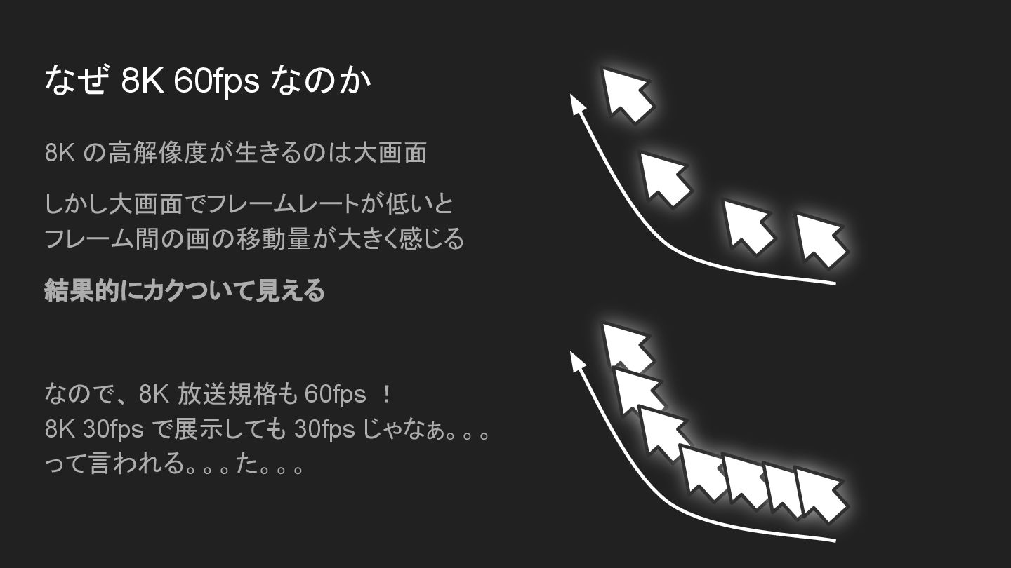 8K の高解像度が生きるのは大画面 しかし大画面でフレームレートが低いと フレーム間の画の移動量が大きく感じる 結果的にカクついて見える なので、 8K 放送規格も 60fps !