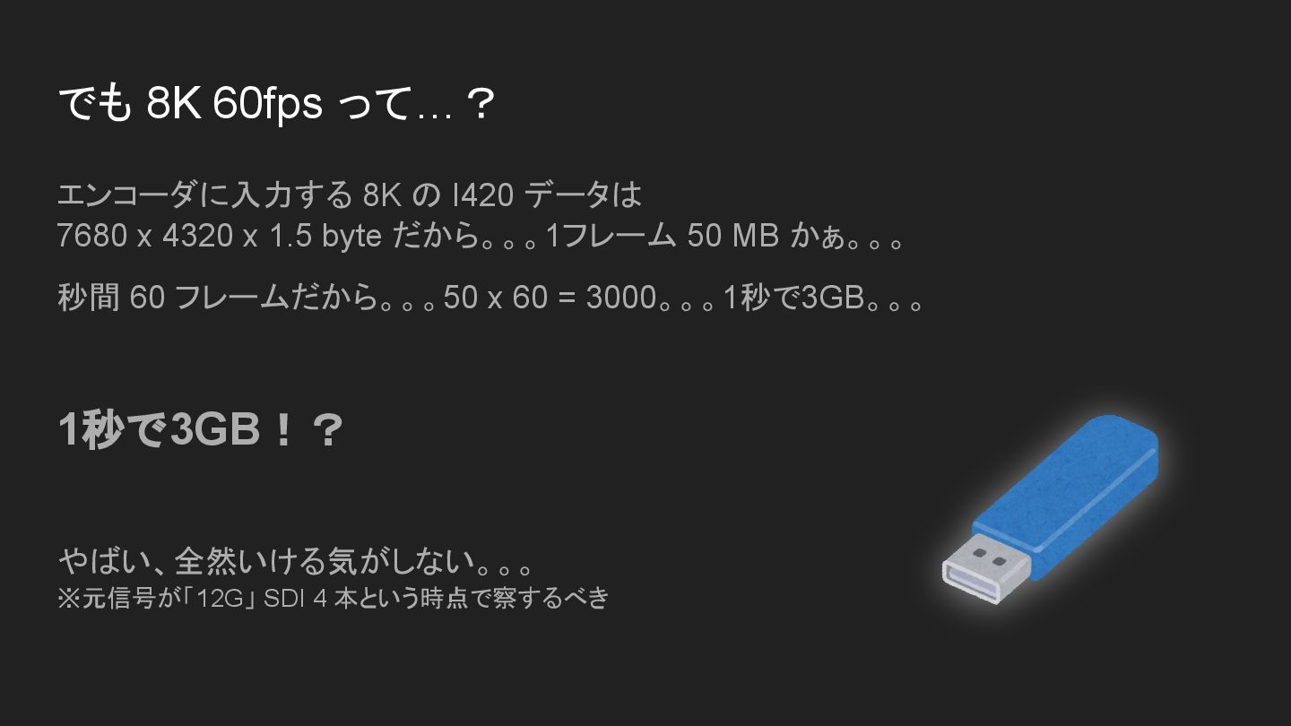 x 4320 x 1.5 byte だから。。。1フレーム 50 MB かぁ。。。 秒間 60 フレームだから。。。50 x 60 = 3000。。。1秒で3GB。。。 1秒で3GB!? やばい、全然いける気がしない。。。 ※元信号が「12G」 SDI 4 本という時点で察するべき
