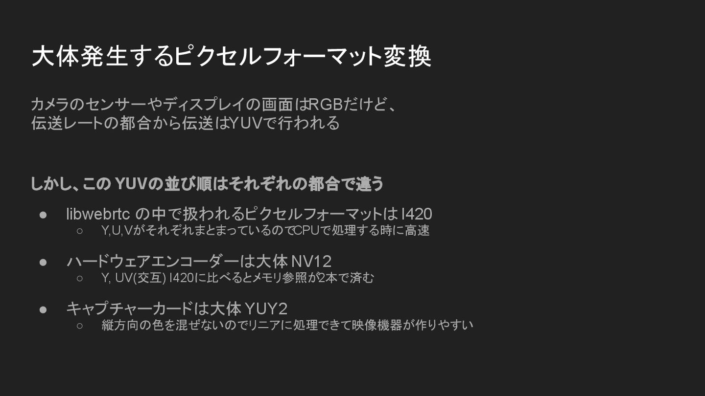 大体発生するピクセルフォーマット変換 カメラのセンサーやディスプレイの画面はRGBだけど、 伝送レートの都合から伝送はYUVで行われる しかし、このYUVの並び順はそれぞれの都合で違う • libwebrtc の中で扱われるピクセルフォーマットは I420 ◦ Y,U,VがそれぞれまとまっているのでCPUで処理する時に高速