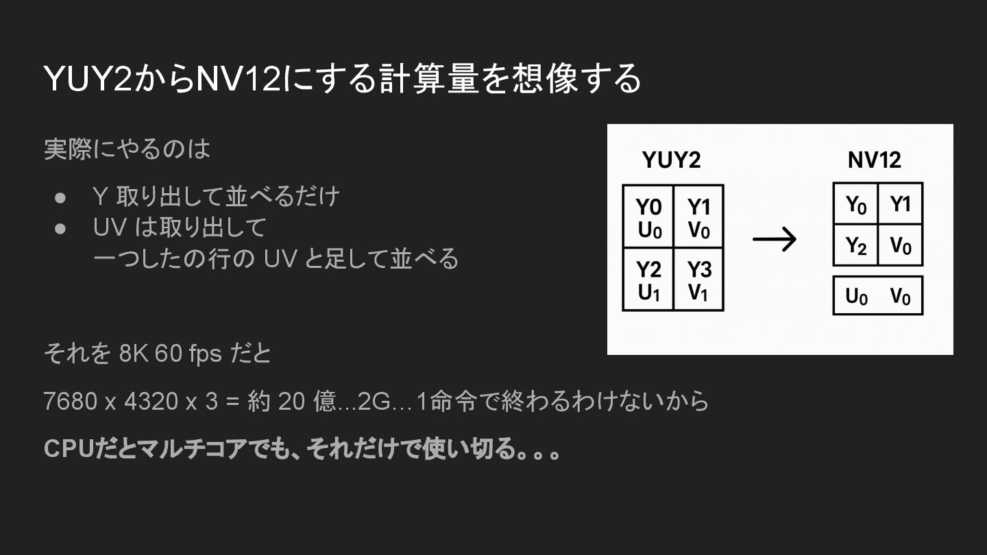 • ハードウェアエンコーダーは大体 NV12 ◦ Y, UV(交互) I420に比べるとメモリ参照が2本で済む • キャプチャーカードは大体 YUY2 ◦ 縦方向の色を混ぜないのでリニアに処理できて映像機器が作りやすい