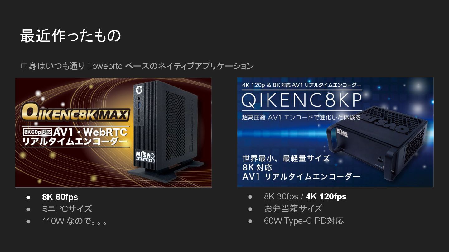 8K 30fps / 4K 120fps • お弁当箱サイズ • 60W Type-C PD対応 中身はいつも通り libwebrtc ベースのネイティブアプリケーション