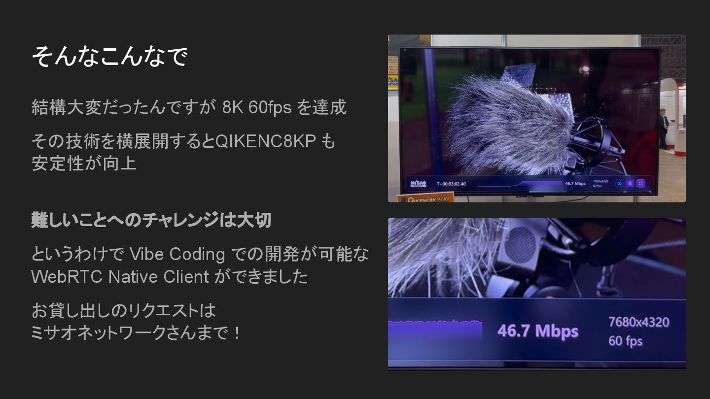 そんなこんなで 結構大変だったんですが 8K 60fps を達成 その技術を横展開するとQIKENC8KP も 安定性が向上 難しいことへのチャレンジは大切 というわけで