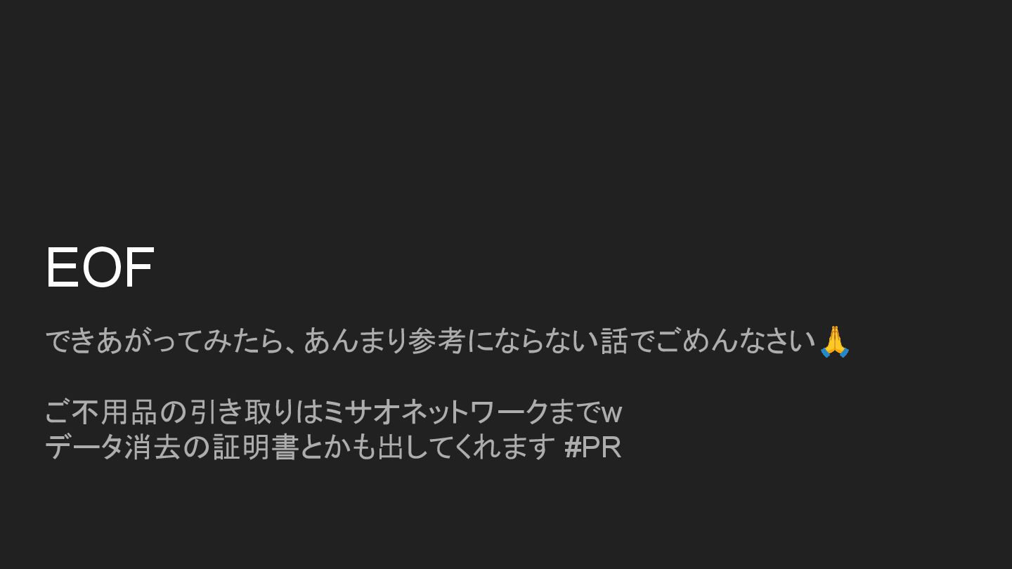 EOF できあがってみたら、あんまり参考にならない話でごめんなさい🙏 ご不用品の引き取りはミサオネットワークまでw データ消去の証明書とかも出してくれます #PR