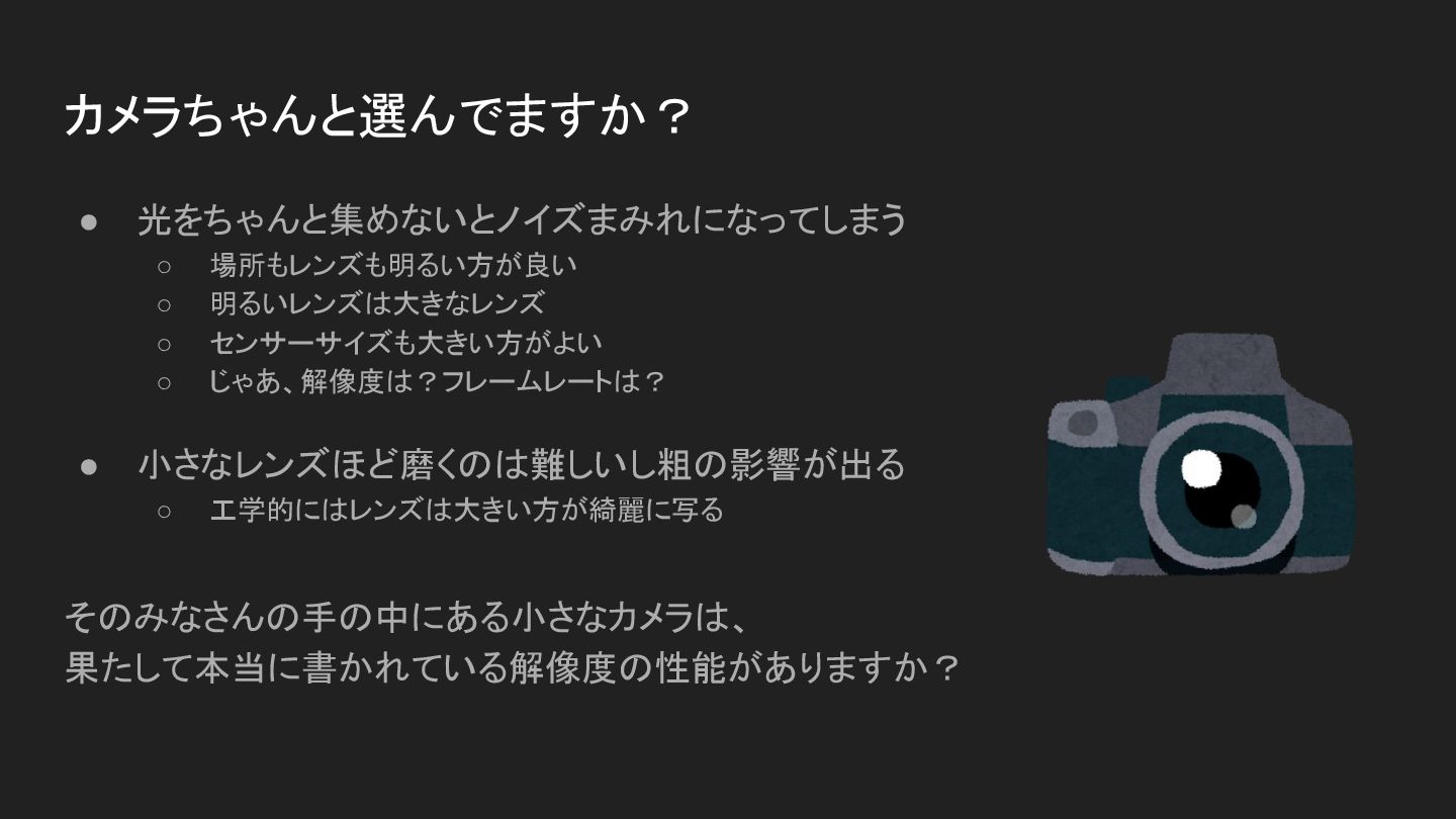 じゃあ、解像度は?フレームレートは? • 小さなレンズほど磨くのは難しいし粗の影響が出る ◦ 工学的にはレンズは大きい方が綺麗に写る そのみなさんの手の中にある小さなカメラは、 果たして本当に書かれている解像度の性能がありますか?