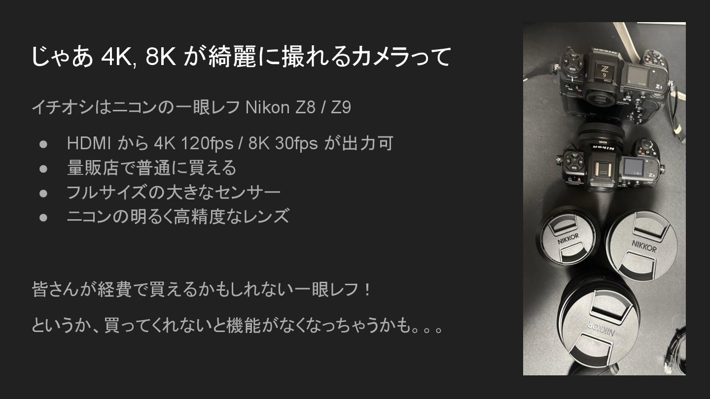 HDMI から 4K 120fps / 8K 30fps が出力可 • 量販店で普通に買える • フルサイズの大きなセンサー • ニコンの明るく高精度なレンズ 皆さんが経費で買えるかもしれない一眼レフ! というか、買ってくれないと機能がなくなっちゃうかも。。。