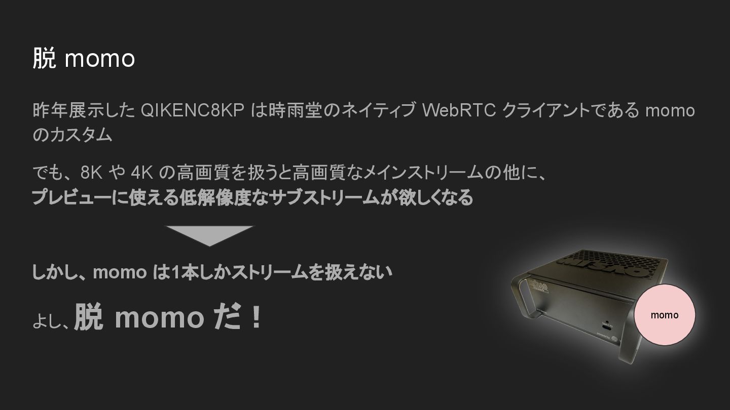 脱 momo 昨年展示した QIKENC8KP は時雨堂のネイティブ WebRTC クライアントである momo のカスタム でも、
