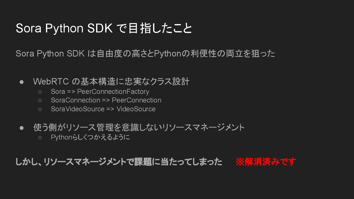 の基本構造に忠実なクラス設計 ◦ Sora => PeerConnectionFactory ◦ SoraConnection => PeerConnection ◦ SoraVideoSource => VideoSource • 使う側がリソース管理を意識しないリソースマネージメント ◦ Pythonらしくつかえるように しかし、リソースマネージメントで課題に当たってしまった ※解消済みです