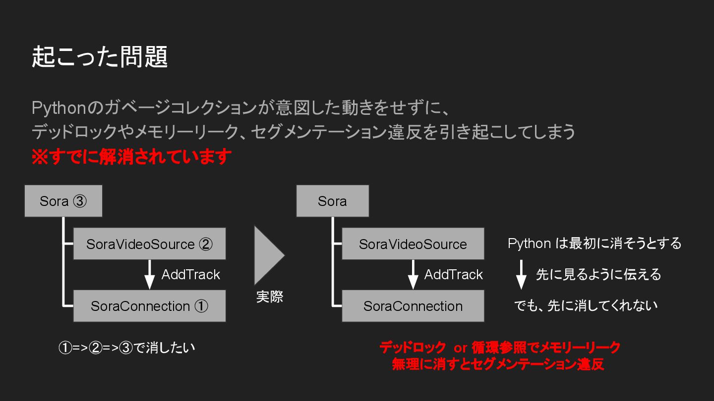 起こった問題 Pythonのガベージコレクションが意図した動きをせずに、 デッドロックやメモリーリーク、セグメンテーション違反を引き起こしてしまう ※すでに解消されています Sora ③ SoraConnection ① SoraVideoSource ②
