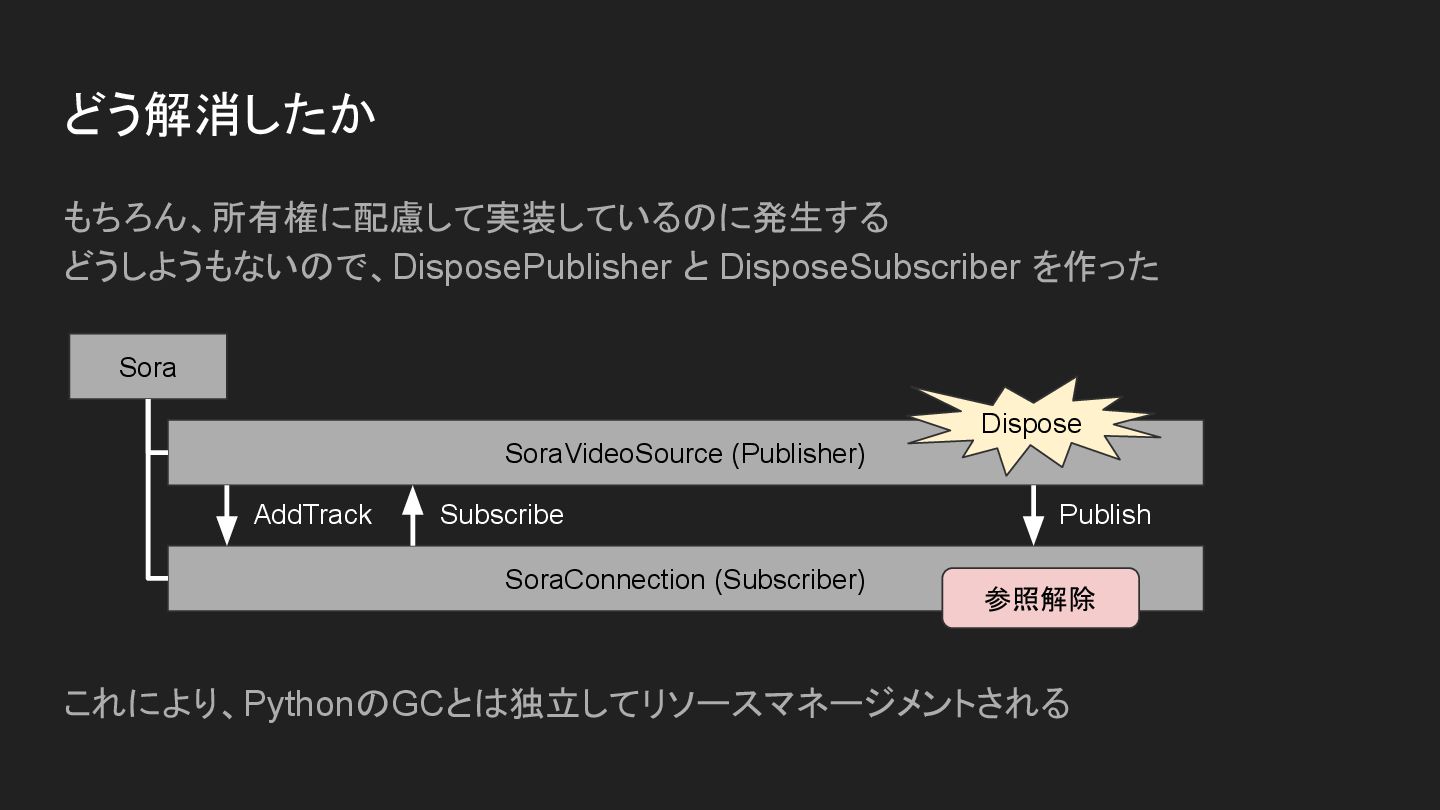 (Publisher) AddTrack Subscribe Publish Dispose 参照解除 これにより、PythonのGCとは独立してリソースマネージメントされる