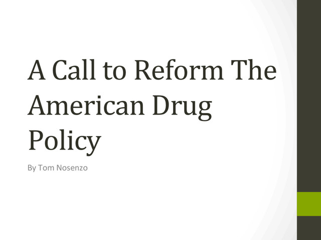 the past by legislaCve bodies…BUT THIS SENATE CAN CHANGE THAT! • MisinformaCon campaigns have crept into convenConal thought regarding The American Drug Policy • Racial profiling and mass incarceraCon are problems directly associated with The American Drug Policy • Truly has been ineffecCve in stopping the ‘drug problem’ • Reform is necessary!