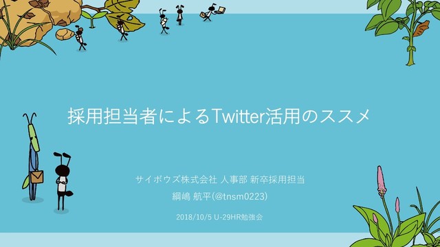 採用担当者によるTwitter活用のススメ サイボウズ株式会社 人事部 新卒採用担当 綱嶋 航平(@tnsm0223) 2018/10/5 U-29HR勉強会