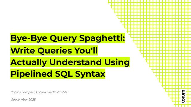 Are your SQL queries becoming tangled webs that are difficult to decipher, debug, and maintain? This talk explores how to write shorter, more debuggable, and extensible SQL code using Pipelined SQL, an alternative syntax where queries are written as a series of orthogonal, understandable steps. We'll survey which databases and query engines currently support pipelined SQL natively or through extensions, and how it can be used on any platform by compiling pipelined SQL to any SQL dialect using open-source tools. A series of real-world examples, comparing traditional and pipelined SQL syntax side by side for a variety of use cases, will show you how to simplify existing code and make complex data transformations intuitive and manageable.