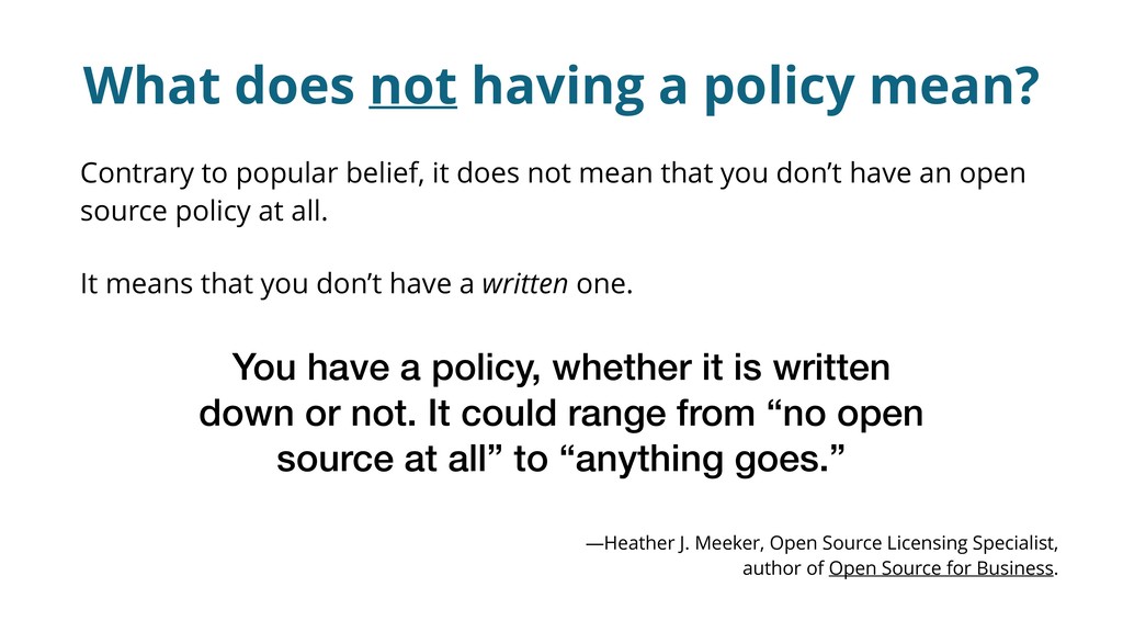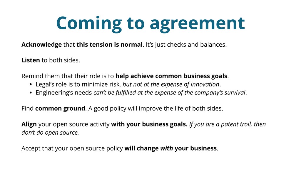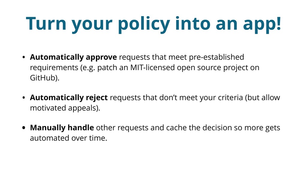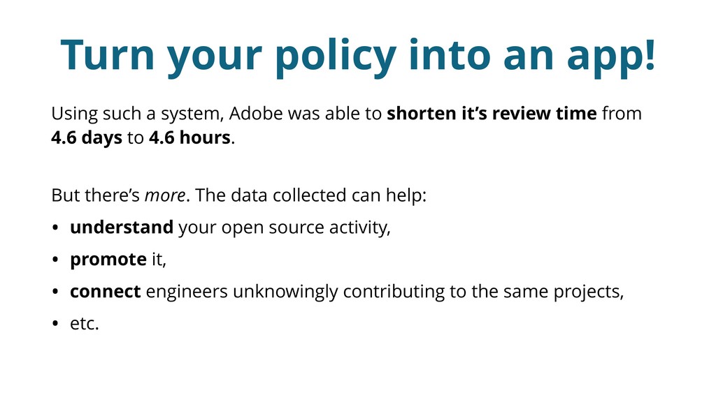 We also look at how to turn these policies into self-service software, preventing the tedious email back and forth between engineering and legal in most cases and making open source contribution a breeze.