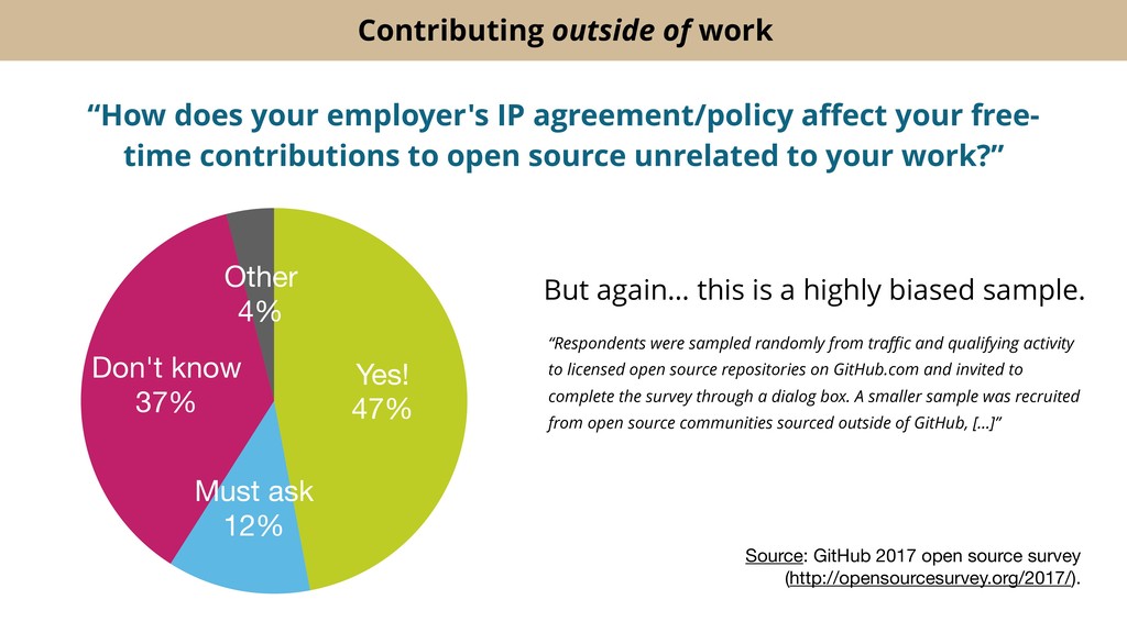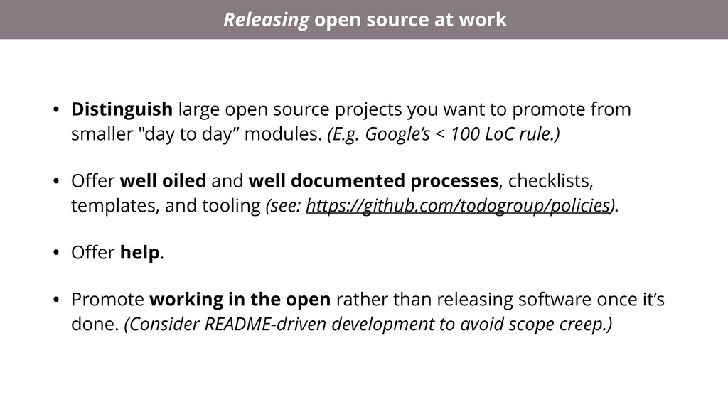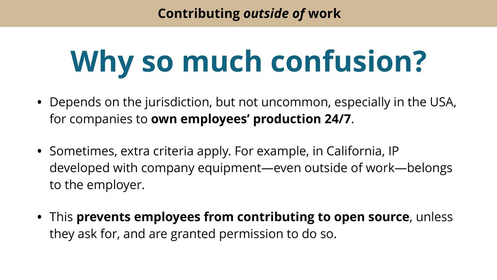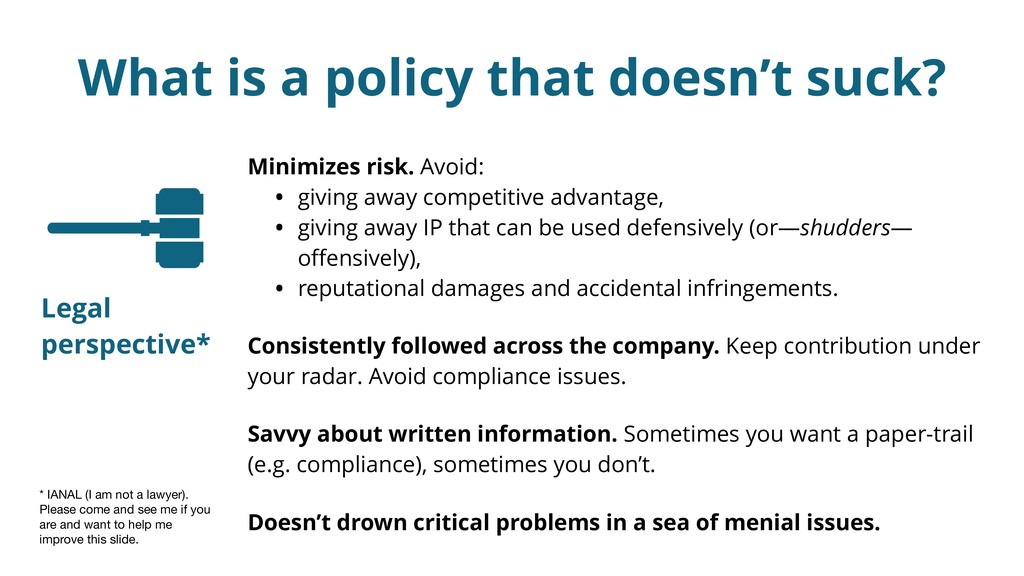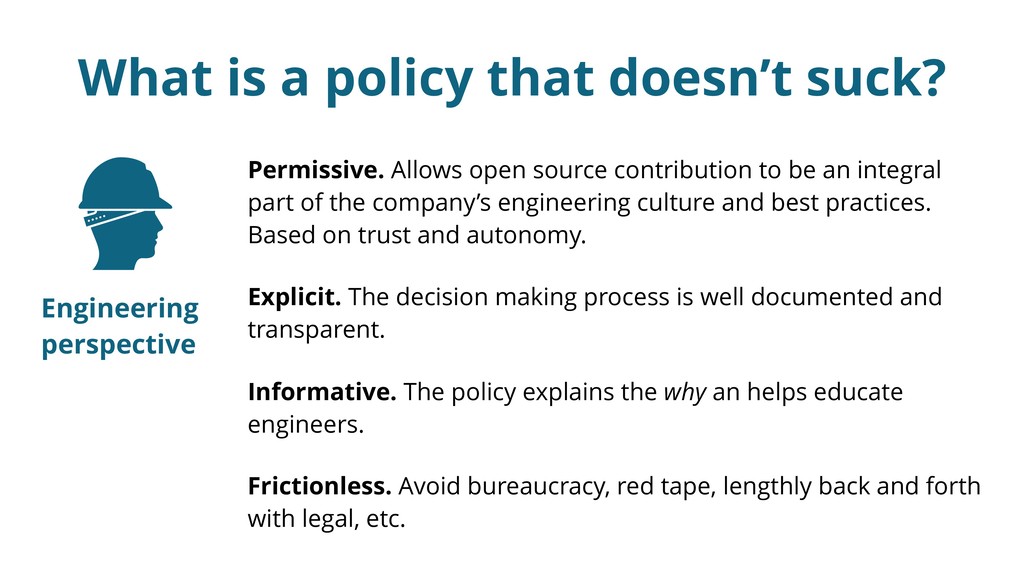 It's possible to write open source contribution policies that make engineers lives easier, boost morale and productivity, reduce attrition, and attract new talent. And it's possible to do so while reducing the company's IP risk, not increasing it.