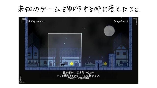 ネコの移動 26 ・キー操作でネコを動かせない ↓ 「正方形の枠内に入ったものだけが動き出す」 という未知の体験を楽しんでほしい。 →正方形の枠がプレイヤー(主役)