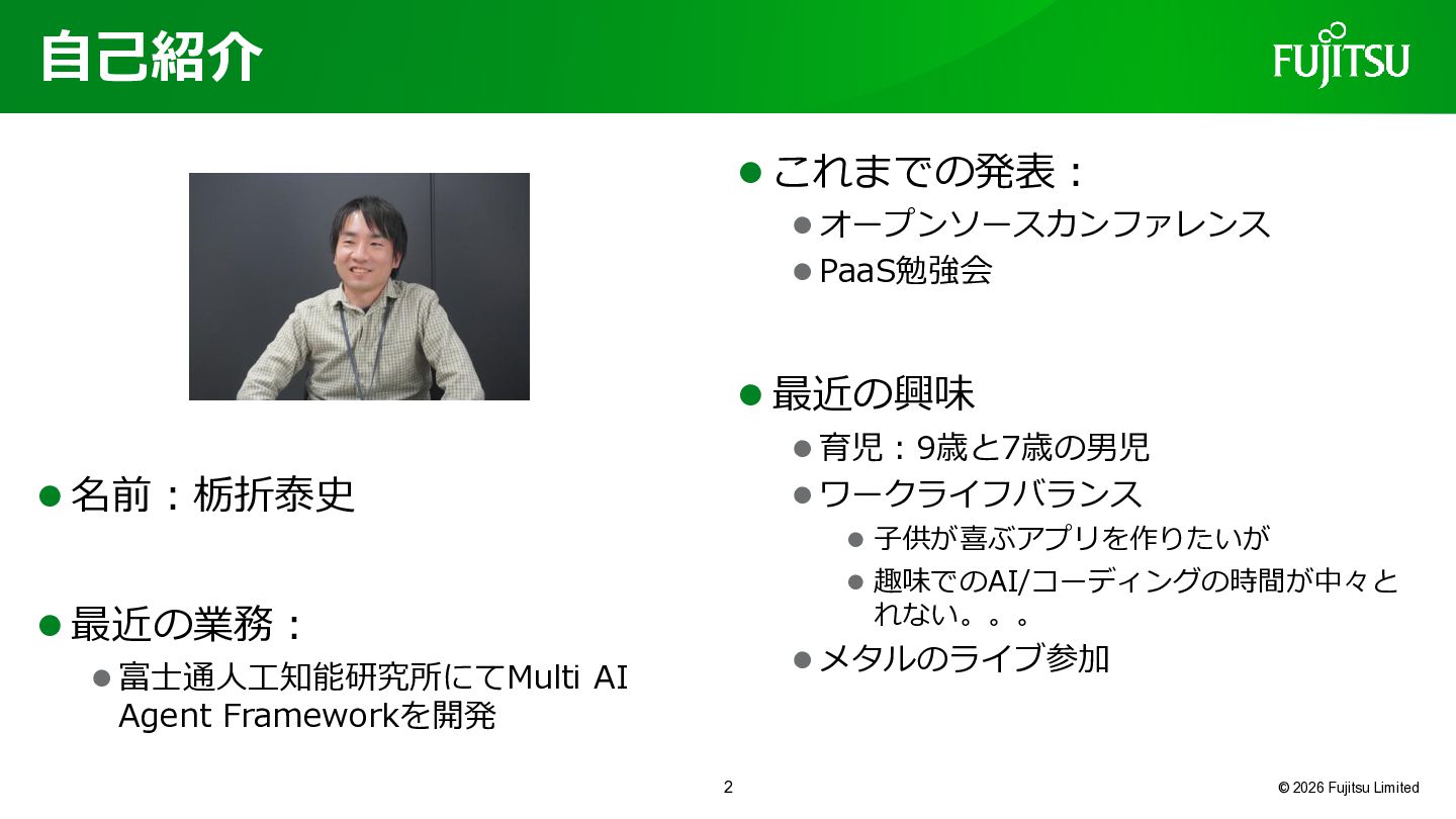 ⚫ これまでの発表: ⚫ オープンソースカンファレンス ⚫ PaaS勉強会 ⚫ 最近の興味 ⚫ 育児:9歳と7歳の男児 ⚫ ワークライフバランス ⚫ 子供が喜ぶアプリを作りたいが ⚫ 趣味でのAI/コーディングの時間が中々と れない。。。 ⚫ メタルのライブ参加 © 2026 Fujitsu Limited 2