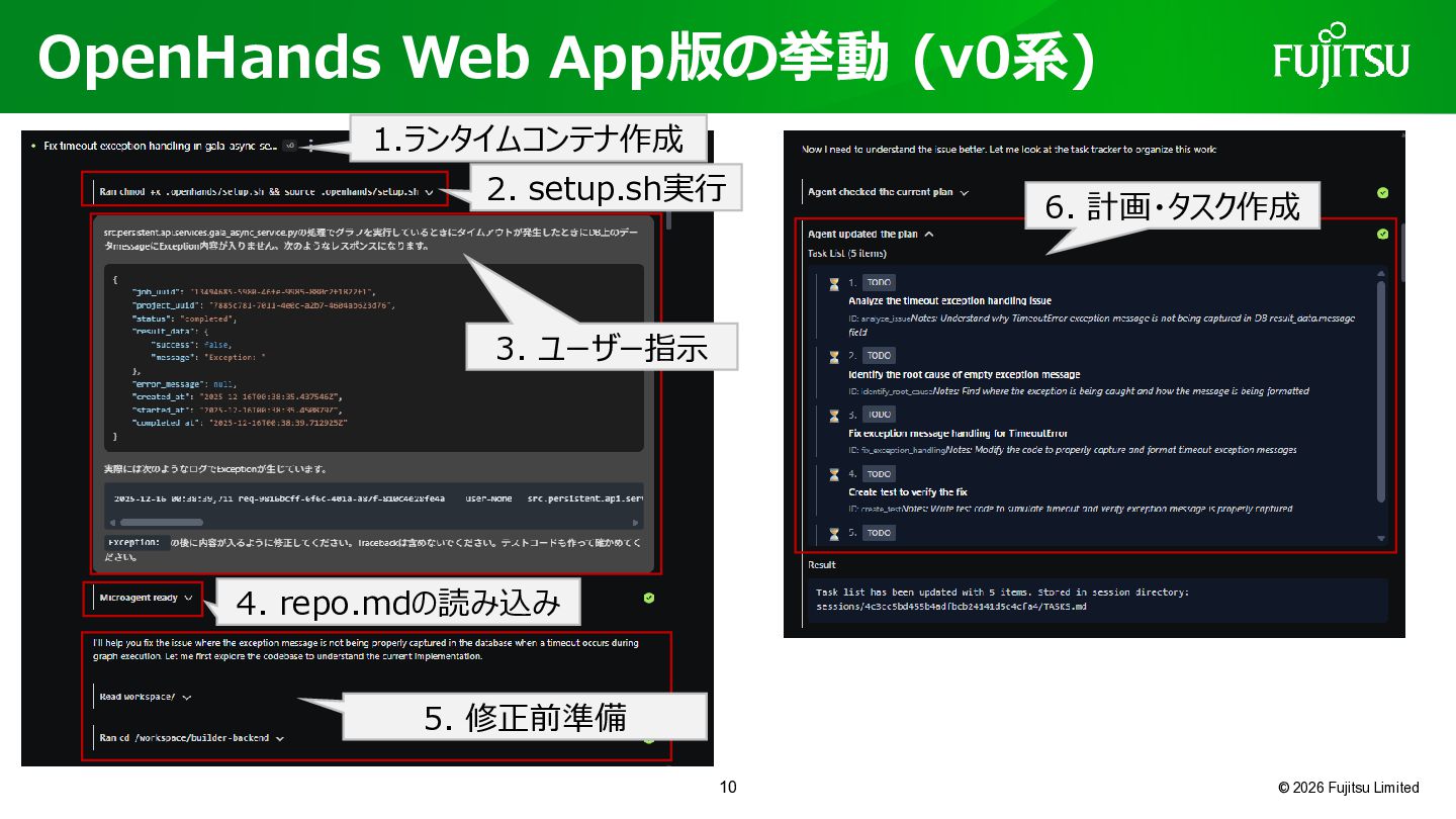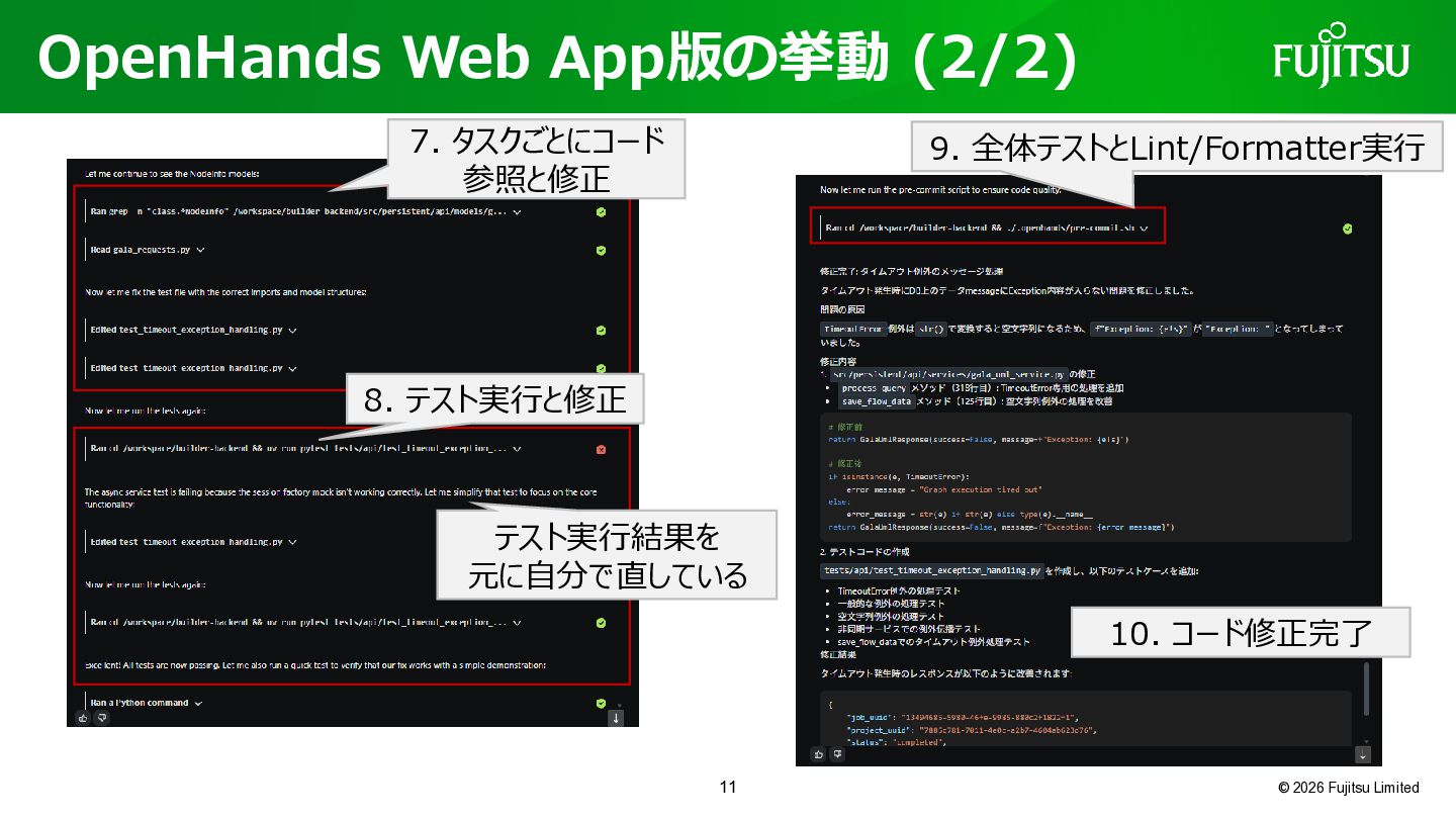 OpenHands Web App版の挙動 (2/2) © 2026 Fujitsu Limited 7. タスクごとにコード