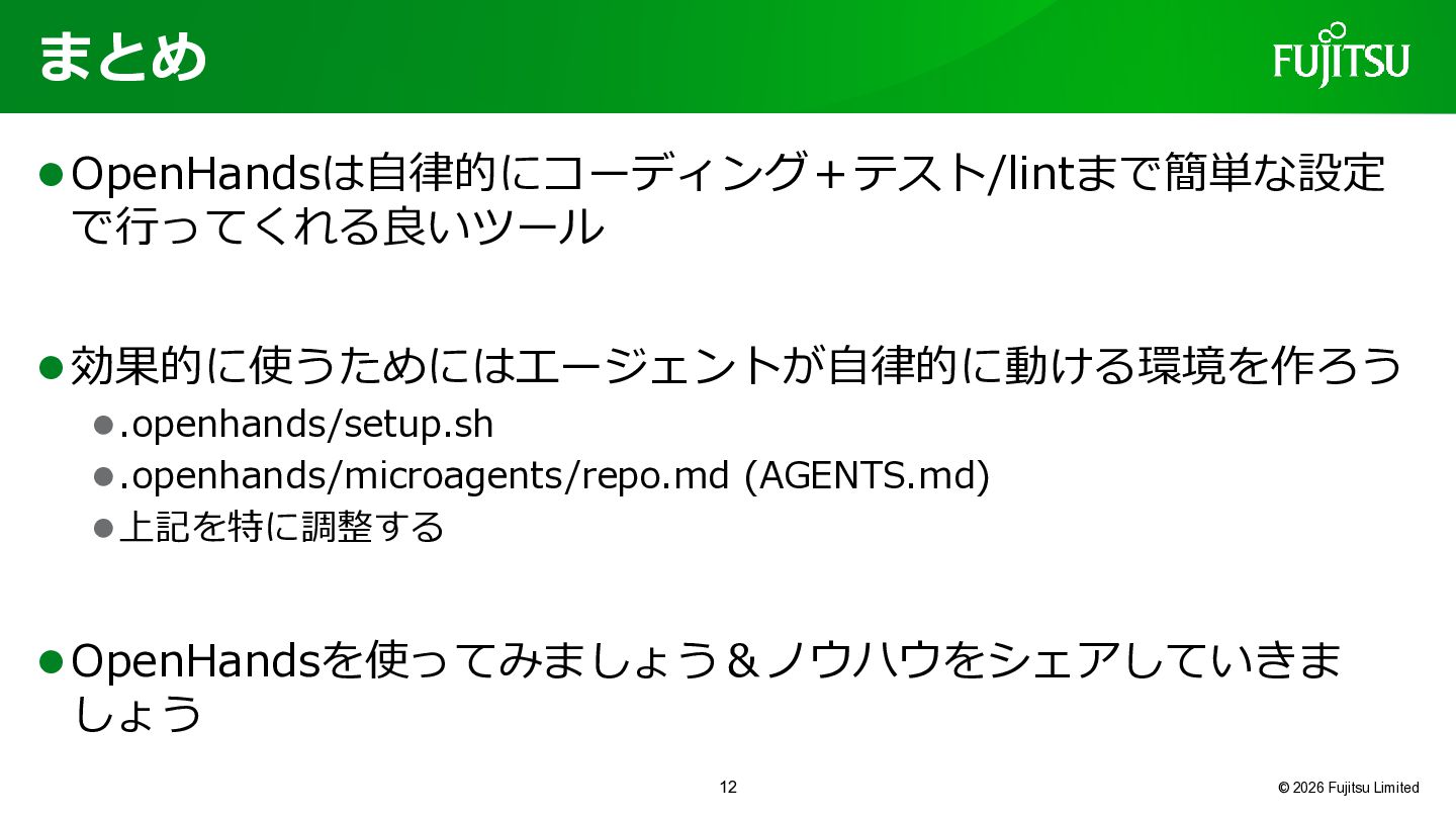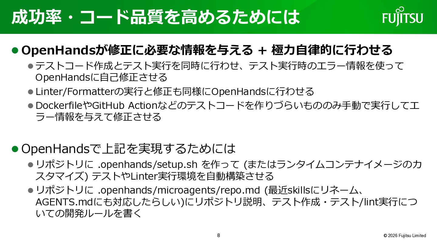 ⚫ DockerfileやGitHub Actionなどのテストコードを作りづらいもののみ手動で実行してエ ラー情報を与えて修正させる ⚫ OpenHandsで上記を実現するためには ⚫ リポジトリに .openhands/setup.sh を作って (またはランタイムコンテナイメージのカ スタマイズ) テストやLinter実行環境を自動構築させる ⚫ リポジトリに .openhands/microagents/repo.md (最近skillsにリネーム、 AGENTS.mdにも対応したらしい)にリポジトリ説明、テスト作成・テスト/lint実行につ いての開発ルールを書く © 2026 Fujitsu Limited 8