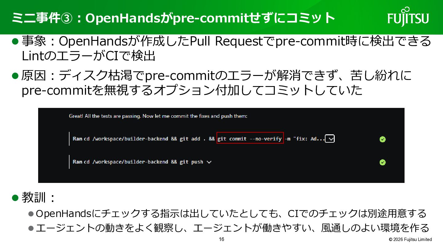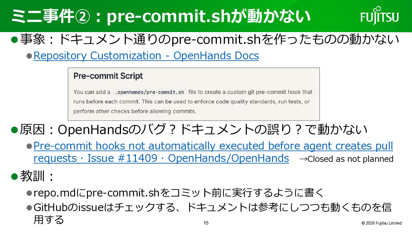 not automatically executed before agent creates pull requests · Issue #11409 · OpenHands/OpenHands →Closed as not planned ⚫教訓: ⚫repo.mdにpre-commit.shをコミット前に実行するように書く ⚫GitHubのissueはチェックする、ドキュメントは参考にしつつも動くものを信 用する © 2026 Fujitsu Limited 15
