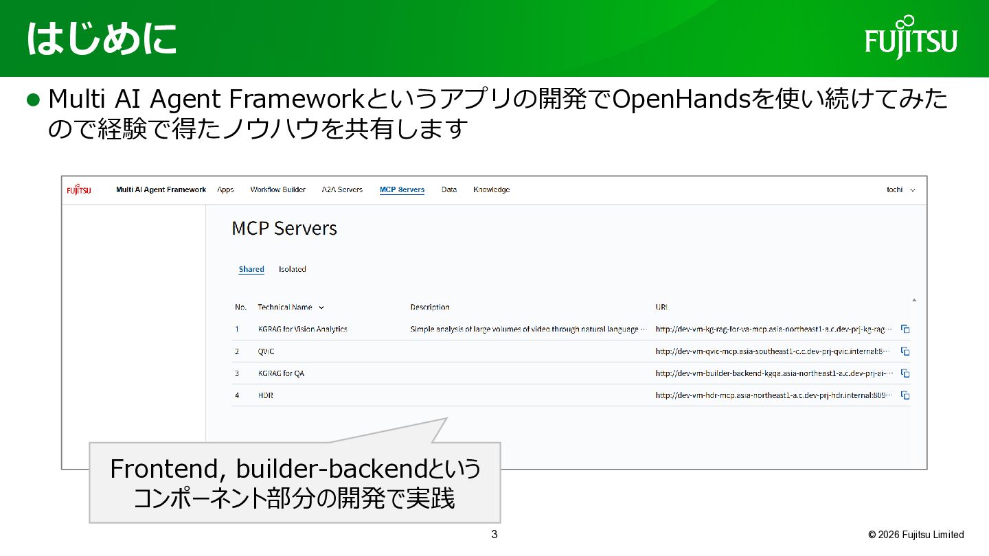 はじめに ⚫ Multi AI Agent Frameworkというアプリの開発でOpenHandsを使い続けてみた ので経験で得たノウハウを共有します © 2026 Fujitsu