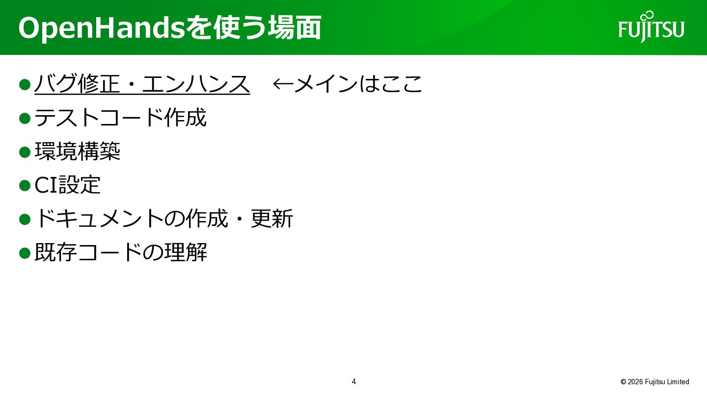 OpenHandsを使う場面 ⚫バグ修正・エンハンス ←メインはここ ⚫テストコード作成 ⚫環境構築 ⚫CI設定 ⚫ドキュメントの作成・更新 ⚫既存コードの理解 © 2026