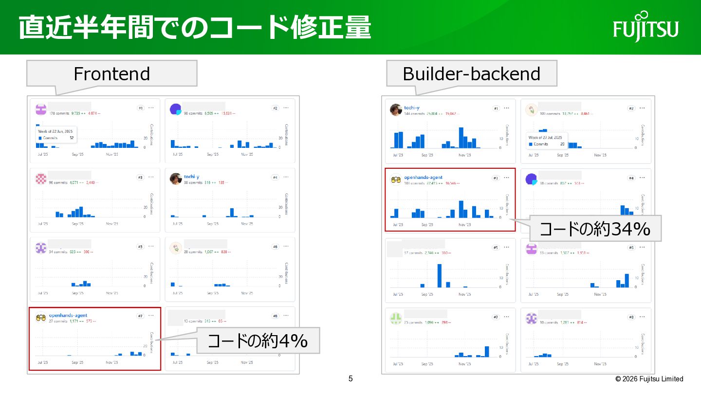 直近半年間でのコード修正量 © 2026 Fujitsu Limited Frontend Builder-backend コードの約4% コードの約34% 5